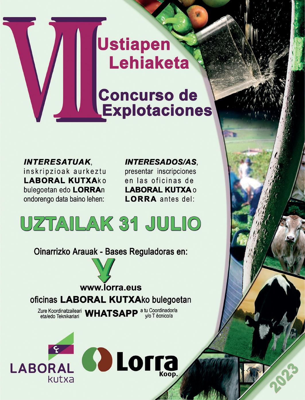 LORRA, con el patrocinio de LABORAL KUTXA, organiza en 2023 la séptima edición del Concurso de Explotaciones, que cuenta con varias categorías: los premios a la mejor explotación agrícola y ganadera de Bizkaia sirve de reconocimiento a aquellas socias y clientes de LORRA S. COOP y LABORAL KUTXA que, interesadas en presentarse, obtengan la calificación de excelente. Se mantiene el