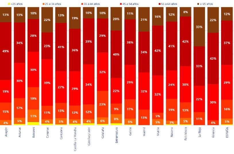 En Euskadi, la situación no es más alentadora. El 8 % de las personas titulares están en activo con más de 65 años; el 42 % se encuentra entre los 55 y 64 años; el 30 % entre los 45 y 54 años; el 13 % entre los 35 y 45 años; el 5 % entre los 25 y 35 años; y finalmente, solo el 2 % son titulares con menos de 25 años.