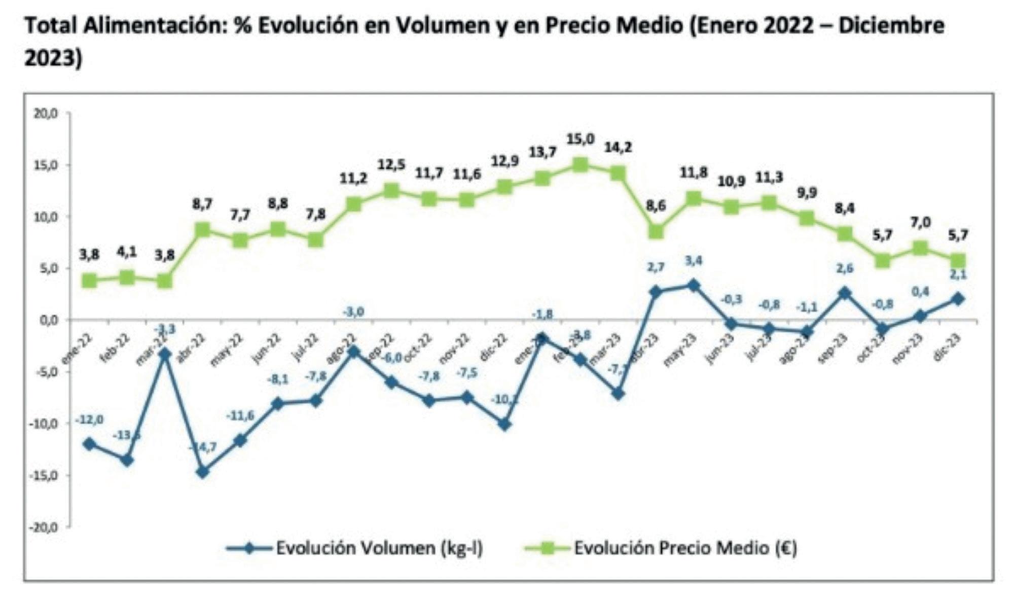 Los españoles consumieron 30.728,56M de Kg/l de alimentos en 2023, un 0,7% menos que en 2022; el gasto subió un 7,5%