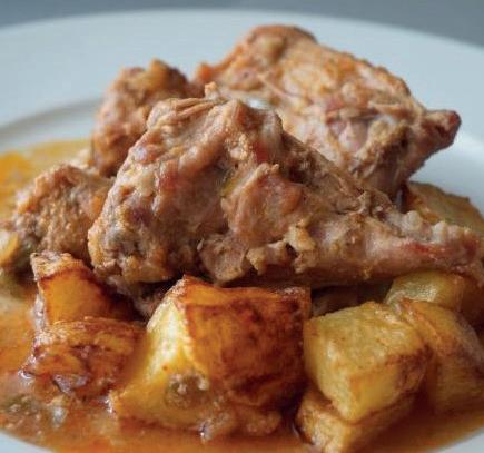 Para acompañar este plato, pela y corta unas patatas en cuadrados, fríelas en abundante aceite y añádelas a la cazuela junto al conejo. Dale un hervor para que las patatas cojan el sabor y ya estará listo. Sirve de inmediato o al día siguiente. En caso de querer servir el plato un día después, puedes calentarlo en la misma cazuela unos minutos.