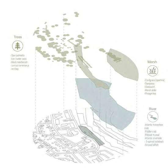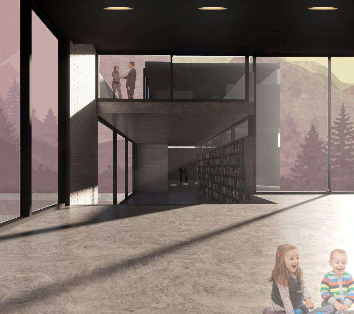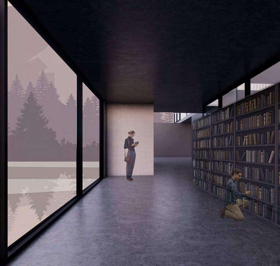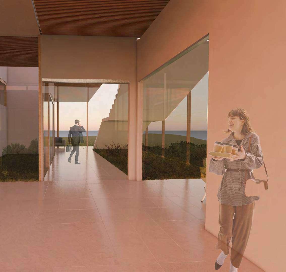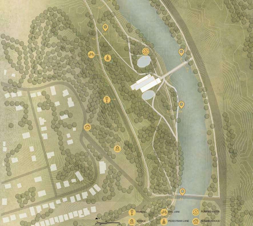 Symbiosis seeks to open dialogue about the relationship between humans and their Environment using the language of Architecture. Originated from a mass broken apart by thunderbolt’s main road, and then reconnected by a ramp spanning over 150 feet, these two volumes materialize the Connection between the neighborhood and the environment.