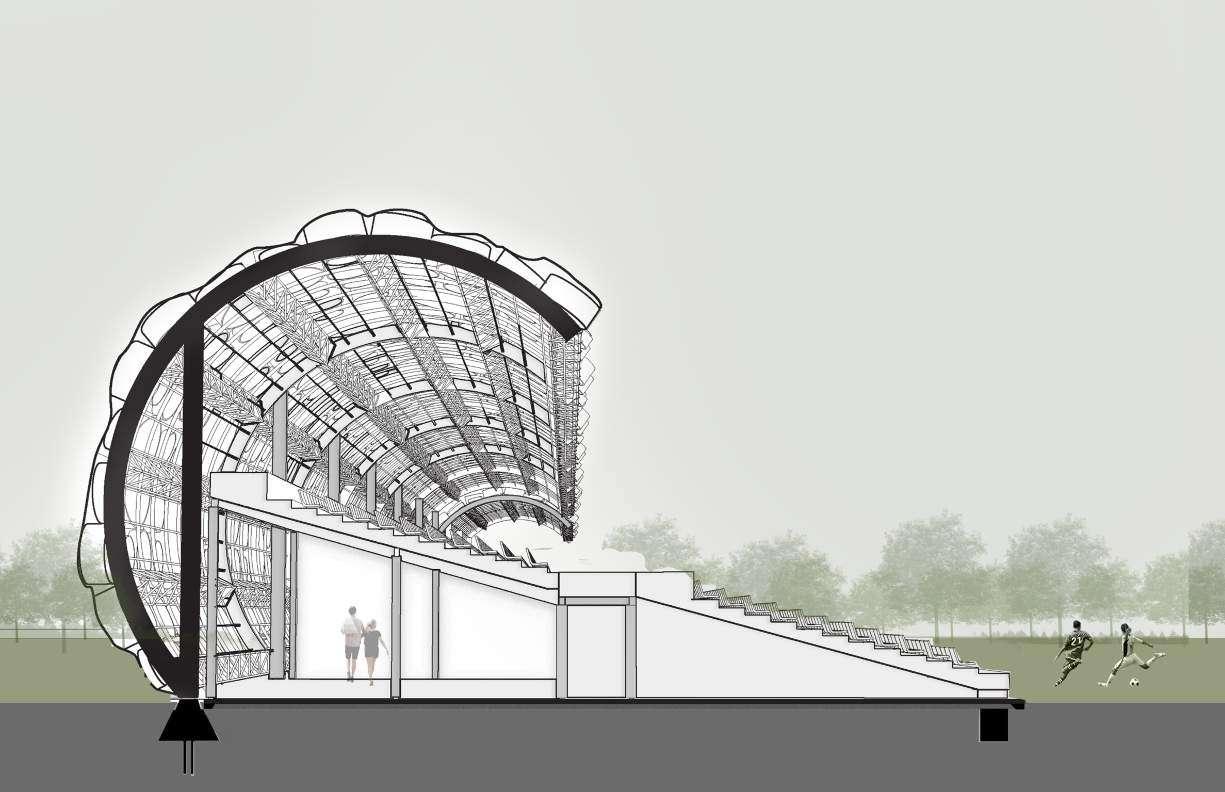 A significant component of the design intervention is the formalization of Morris Field, with the aim of accommodating various sporting events. While providing ample seating for the audience, the super structure goes beyond its primary purpose. Underneath the bleachers, the space is optimized to house facilities for the pitch, as well as the adjacent tennis area. This multifunctional approach maximizes the utility of the area and enhances the overall functionality of the park.