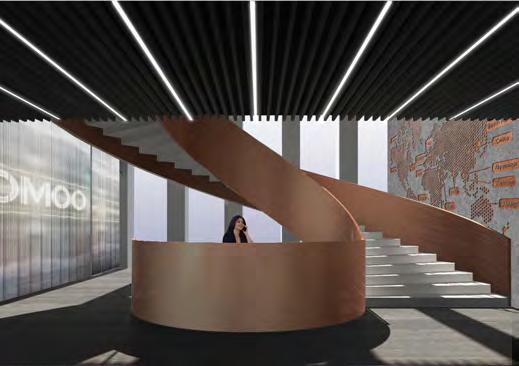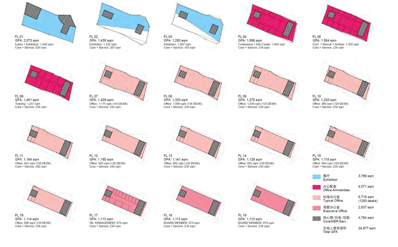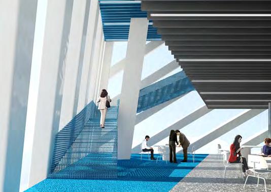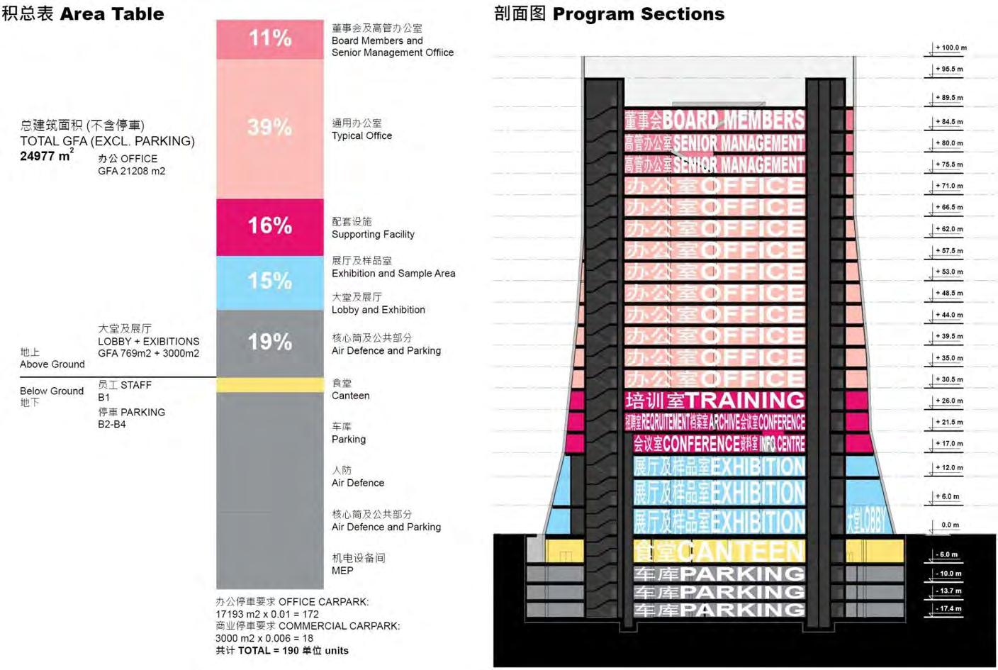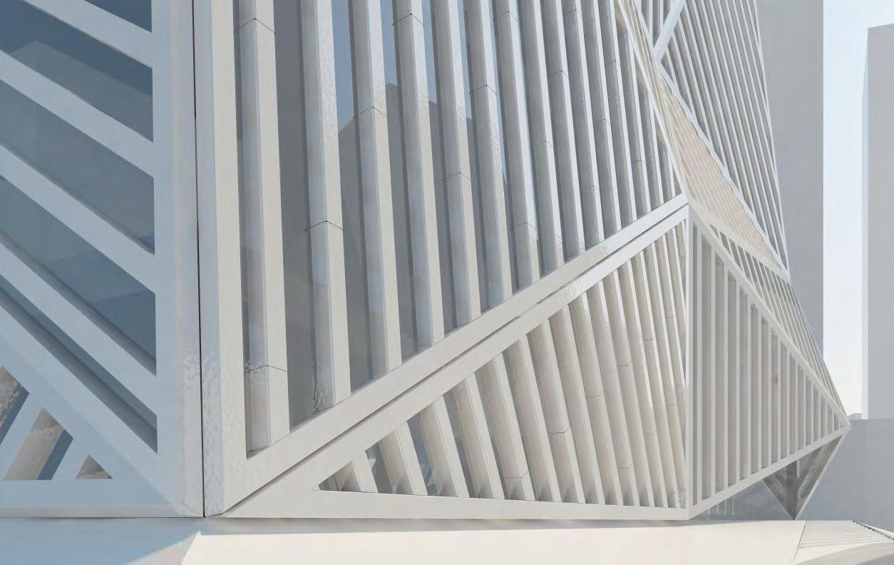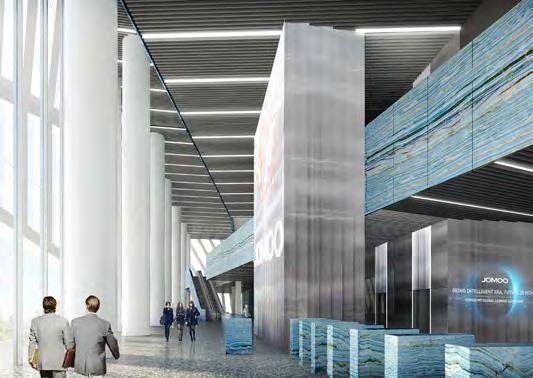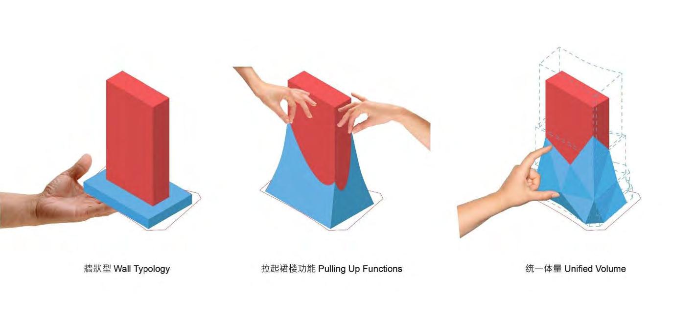 ume that blends an efficient office slab and mountain-like base. The irregular geometry folds and rises to form entrances, with triple height lobby and exhibition halls open to the main road.