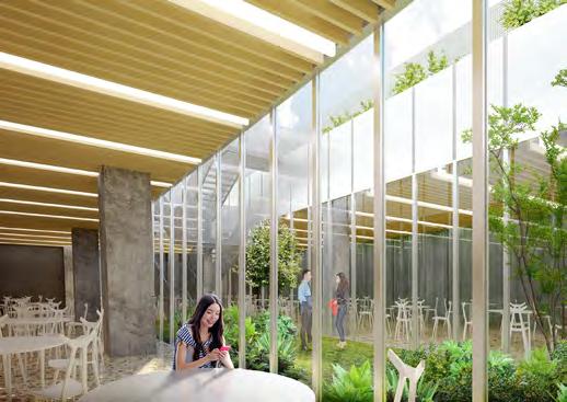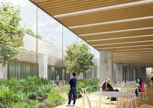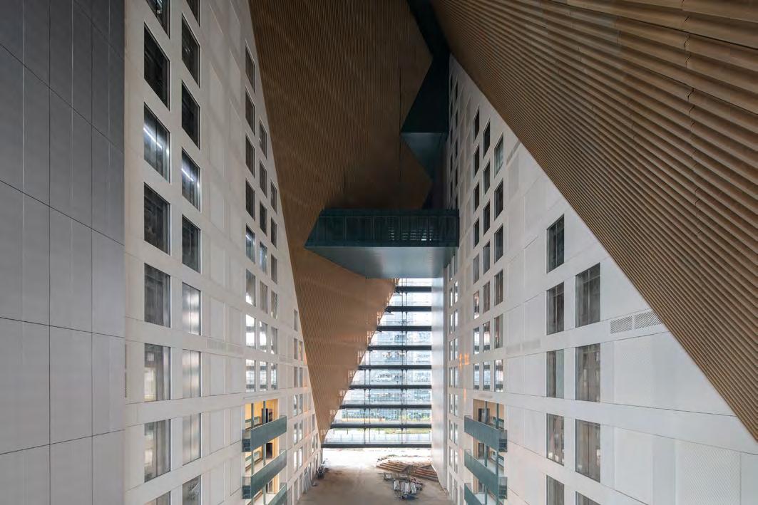shaped by two radical oblique cuts through the building envelope, creating terraced lofts with generous scenic views. A large interior void creates a publicly accessible garden with water features and playgrounds.