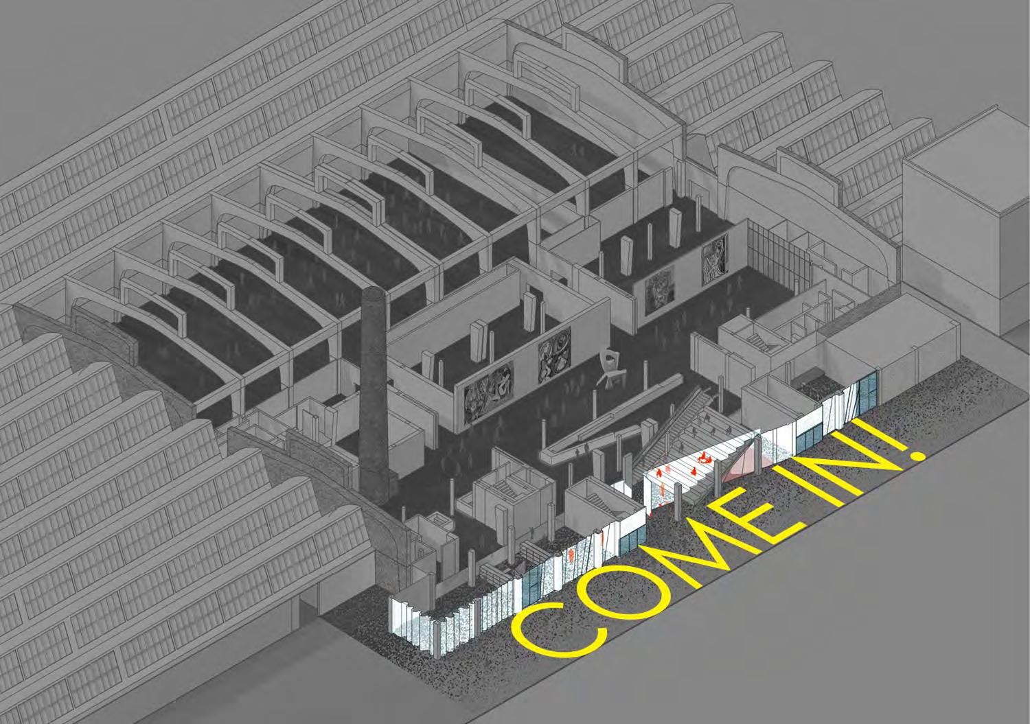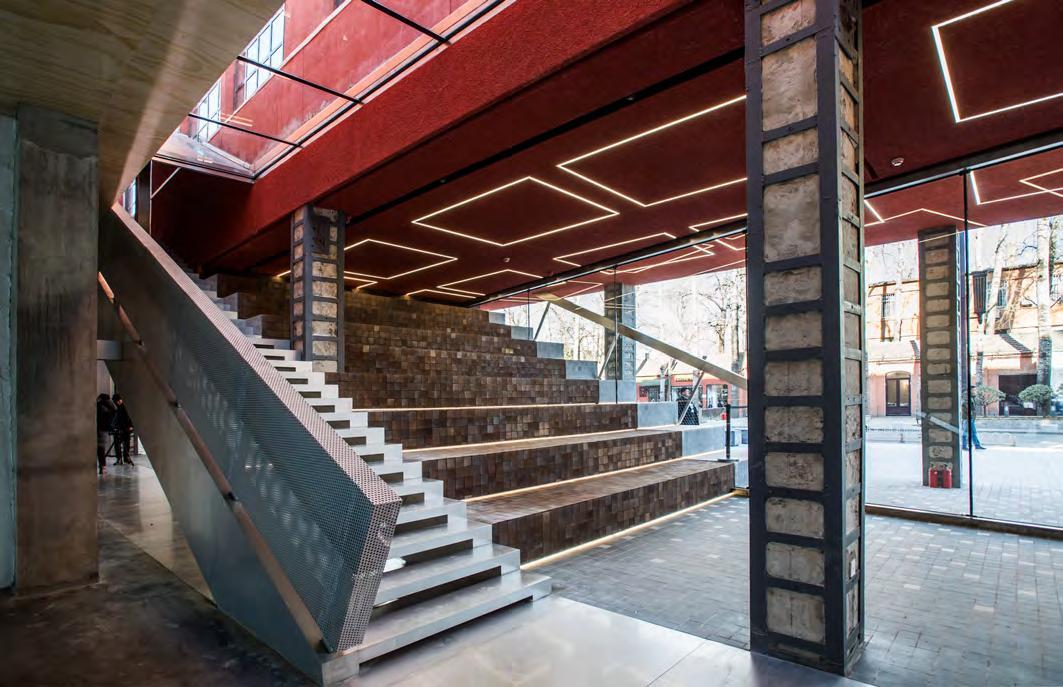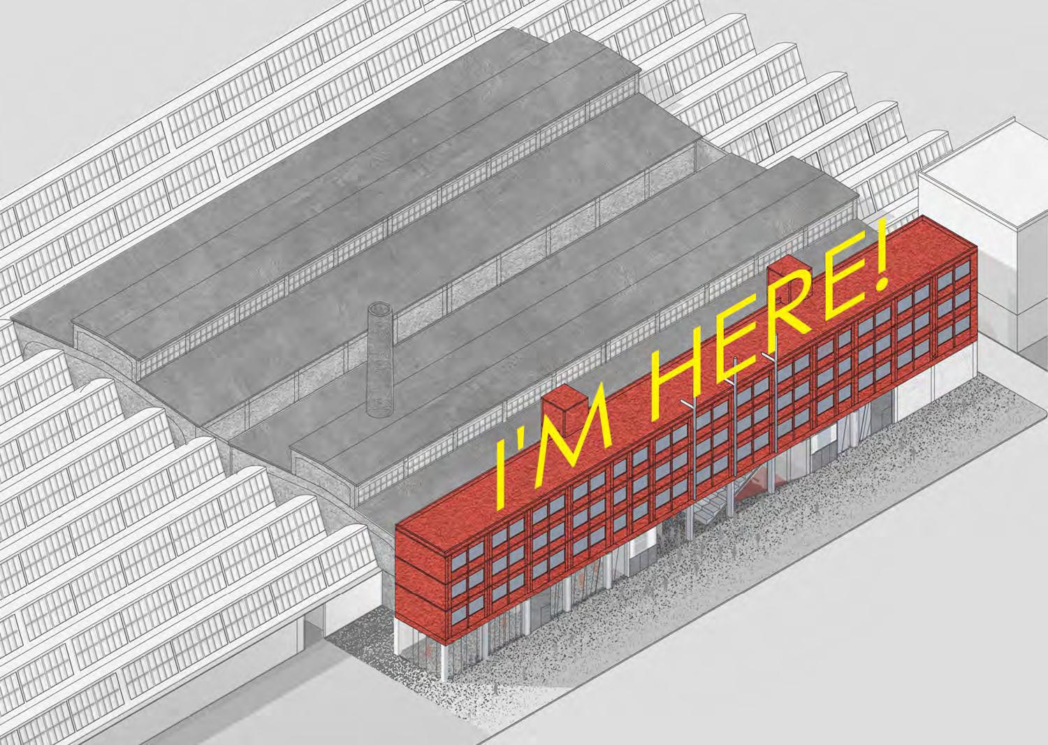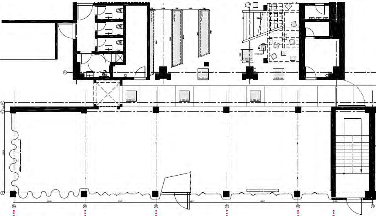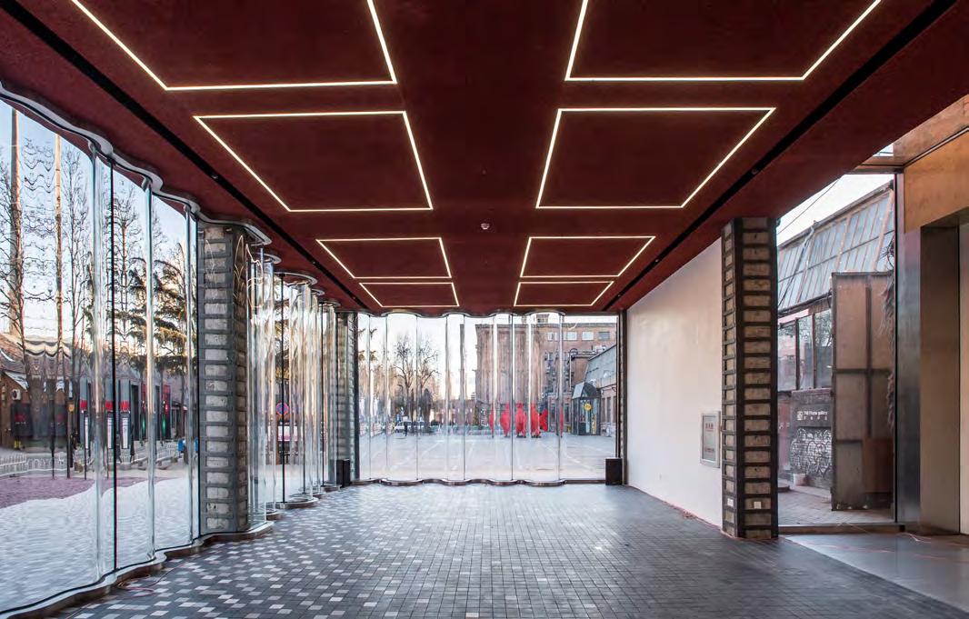 The existing red plastered slab building hovers above the ground floor, giving space for a transparent façade and a view through the building into the public spaces and galleries. The new glass layer separates interior and exterior, not as a traditional flat storefront but an experiment on different ‘imperfections’ of glass: folds, corrugations,