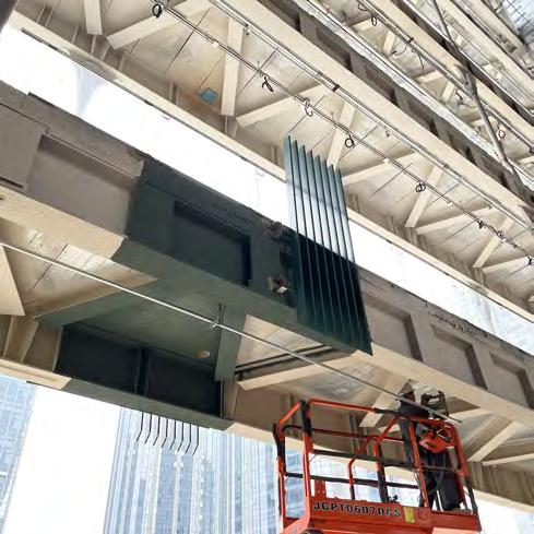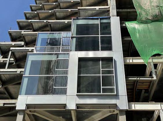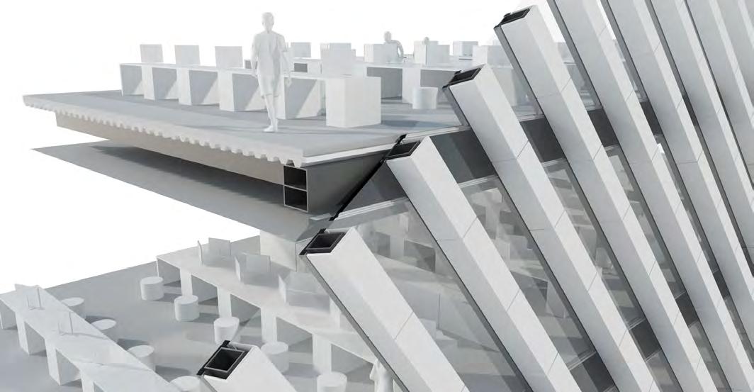 ways. A series of ripple extrusions gradually increase in density from right to left, tumbling back to vertical and transitioning into the big S curves at the left corner. The curvature of the glass panels also provides internal strength, freeing the façade of vertical mullions.
