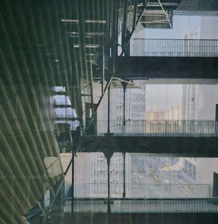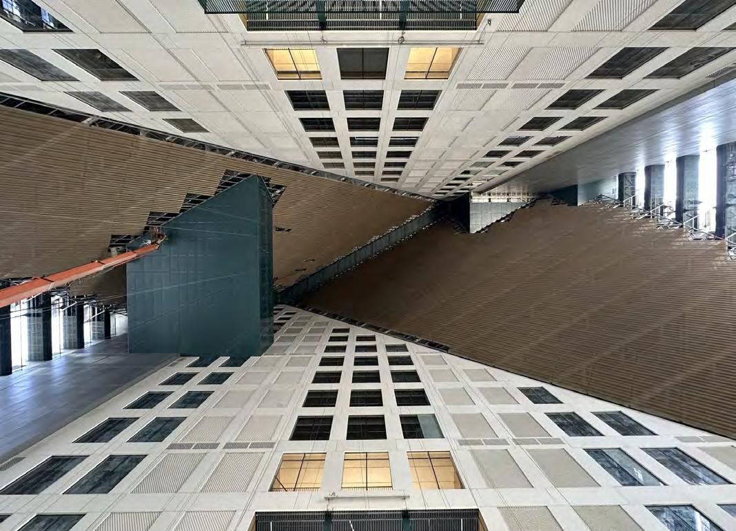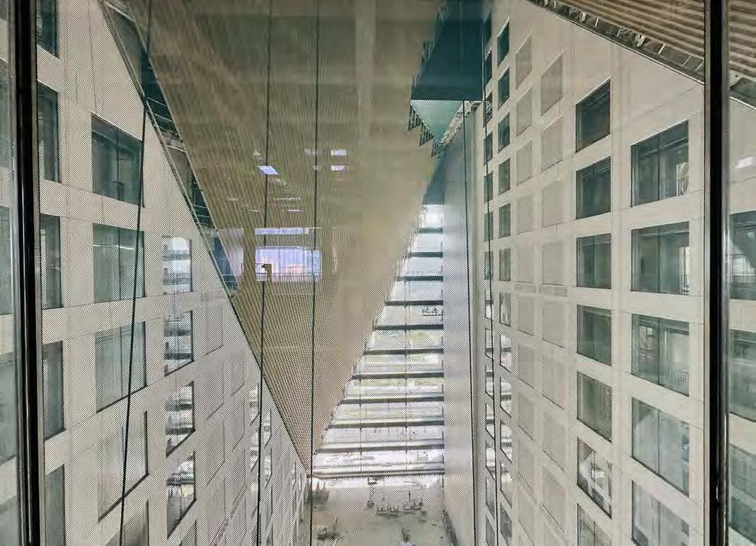 OMA sought to create an image of openness and clarity for the new entrance sequence that starts below the red 1970s administrative slab building. Columns and cores remain, while a thin layer of glass elegantly curves and folds around them; not as a traditional flat storefront but as an experiment on different ‘imperfections’ of glass: corrugations, creases, bulges and bends enacting the internal strength of the material and unravelling waves of visual illusions.