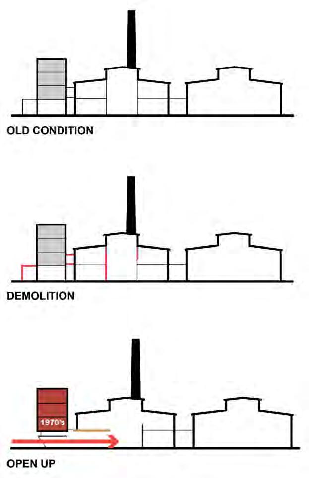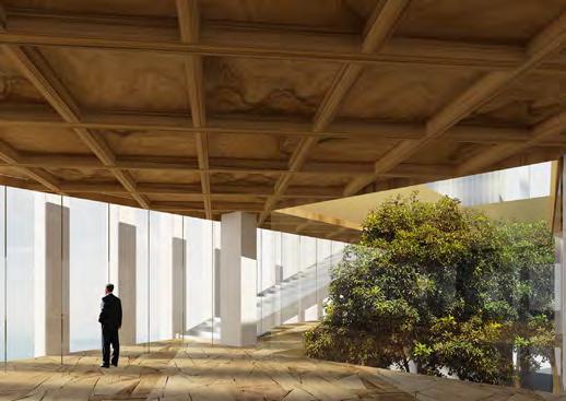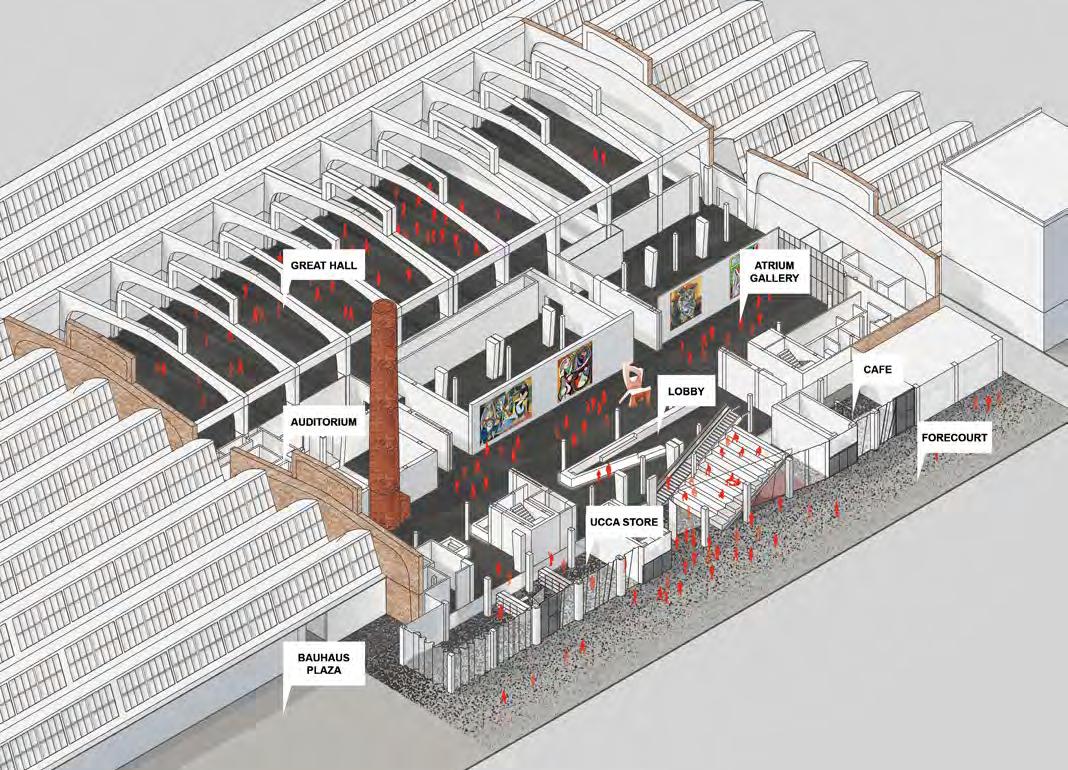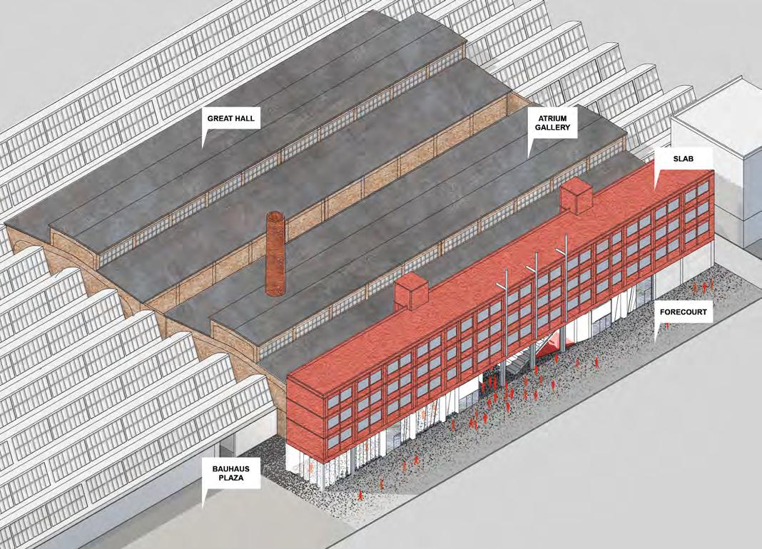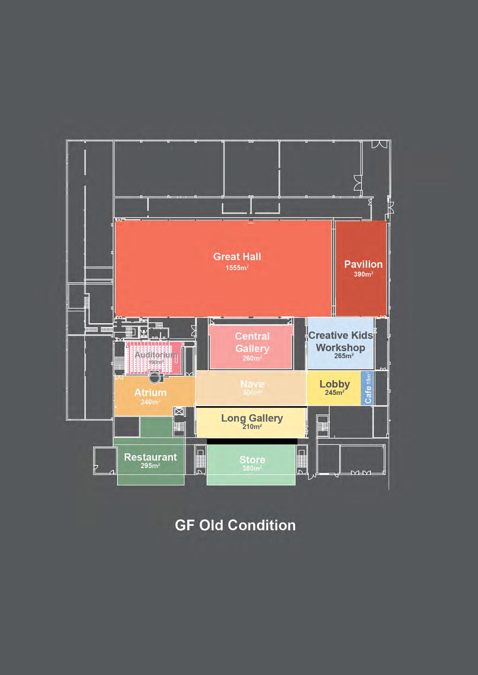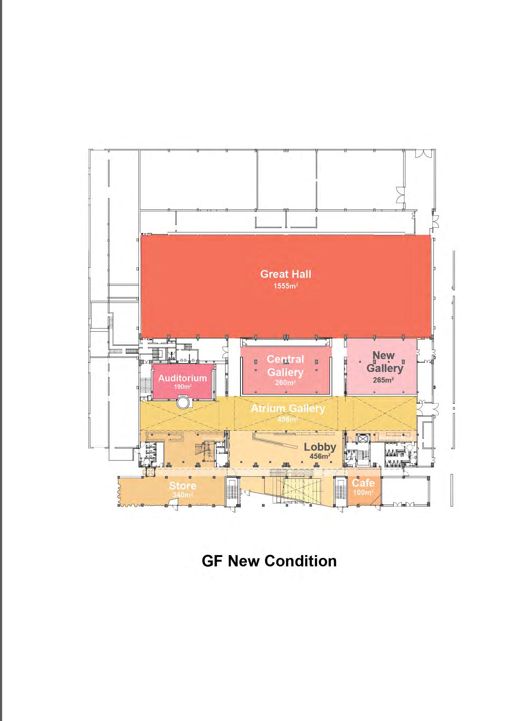 The façade reveals a clear sequence of spatial bands: the new navigation leads from a large landscaped forecourt through the colonnaded space under the slab, passing the alley between the slab and main hall over the aisle underneath a mezzanine floor and through the ‘nave’ of the main hall, to the existing galleries, and ending at the Great Hall.