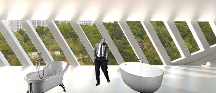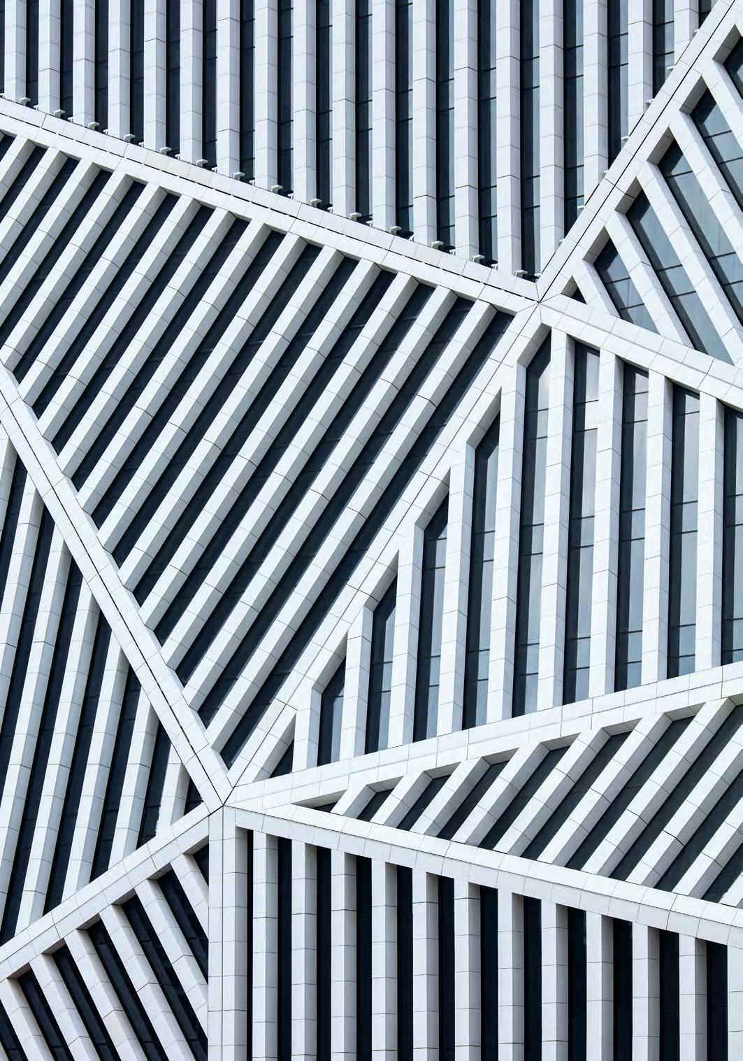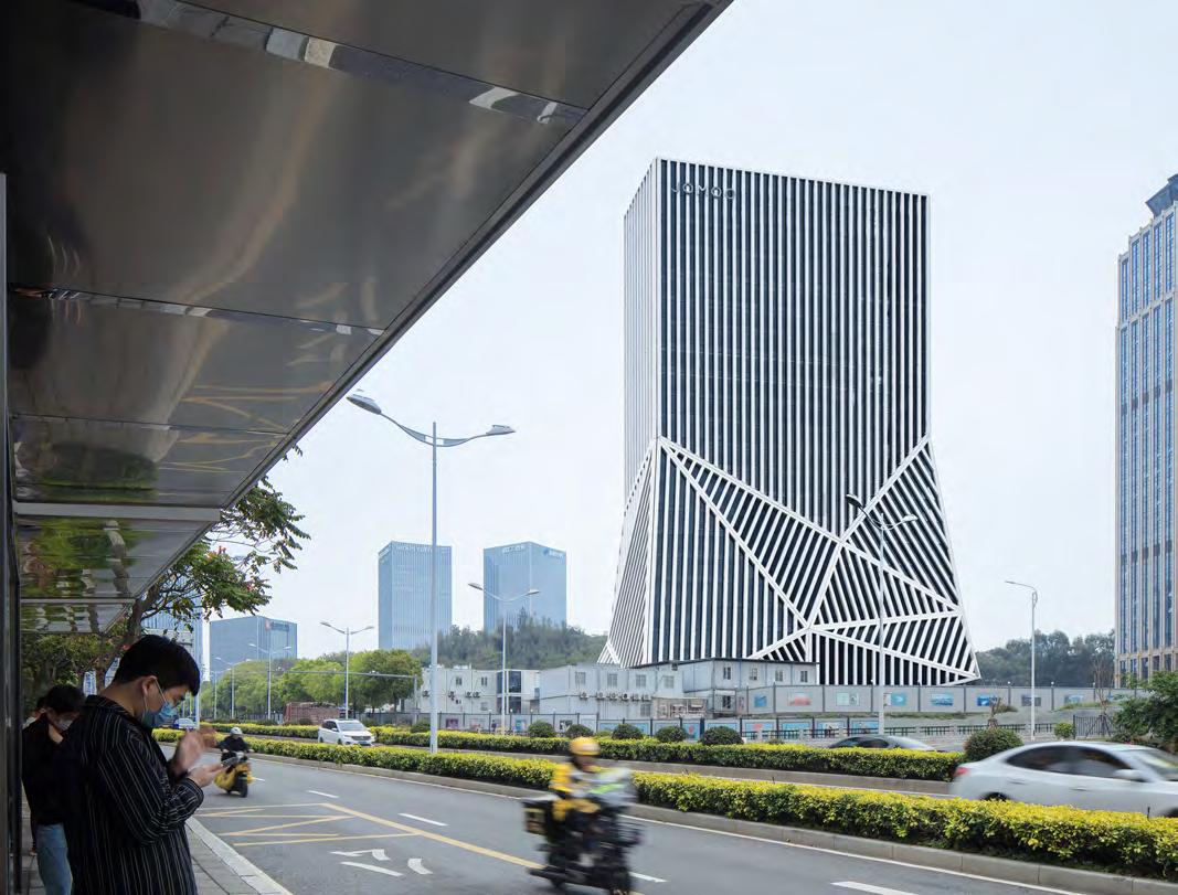 To achieve this contextual form, the tower’s irregular façade also demands a unified system that generates flexible floorplates within a visually distinct envelope; its structural members form thick lines that fold along the faceted façade. The resulting pattern represents the traditional window barring of local Minnan houses. The crisp façade is rendered in the only material appropriate for China’s largest sanitation fixture company: white ceramic.