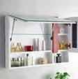 The tops of the cabinets are white acrylic, mounted on top of mirror stainless steel boxes, creating the illusion of floating islands, and the square floor tiles appear uninterrupted.