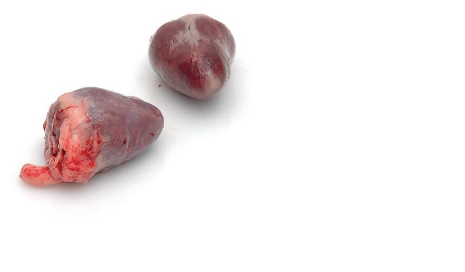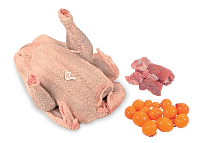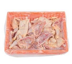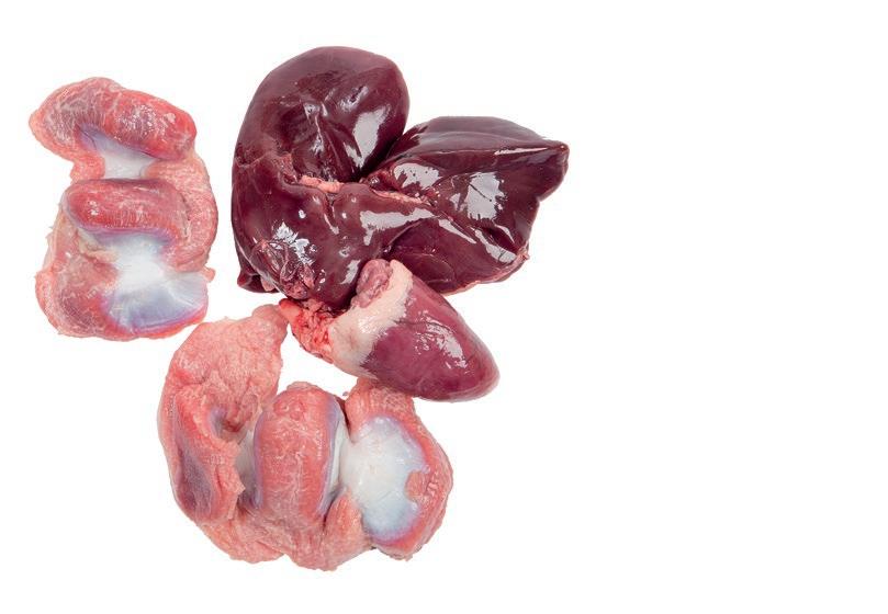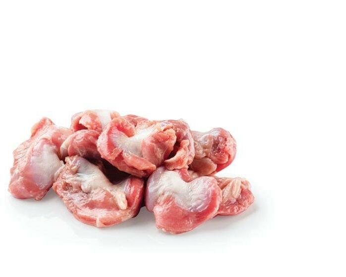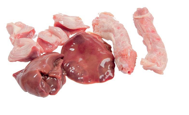 Pollo entero limpio, acompañado de embalaje con menudillos (molleja, hígado, corazón), sin patas.