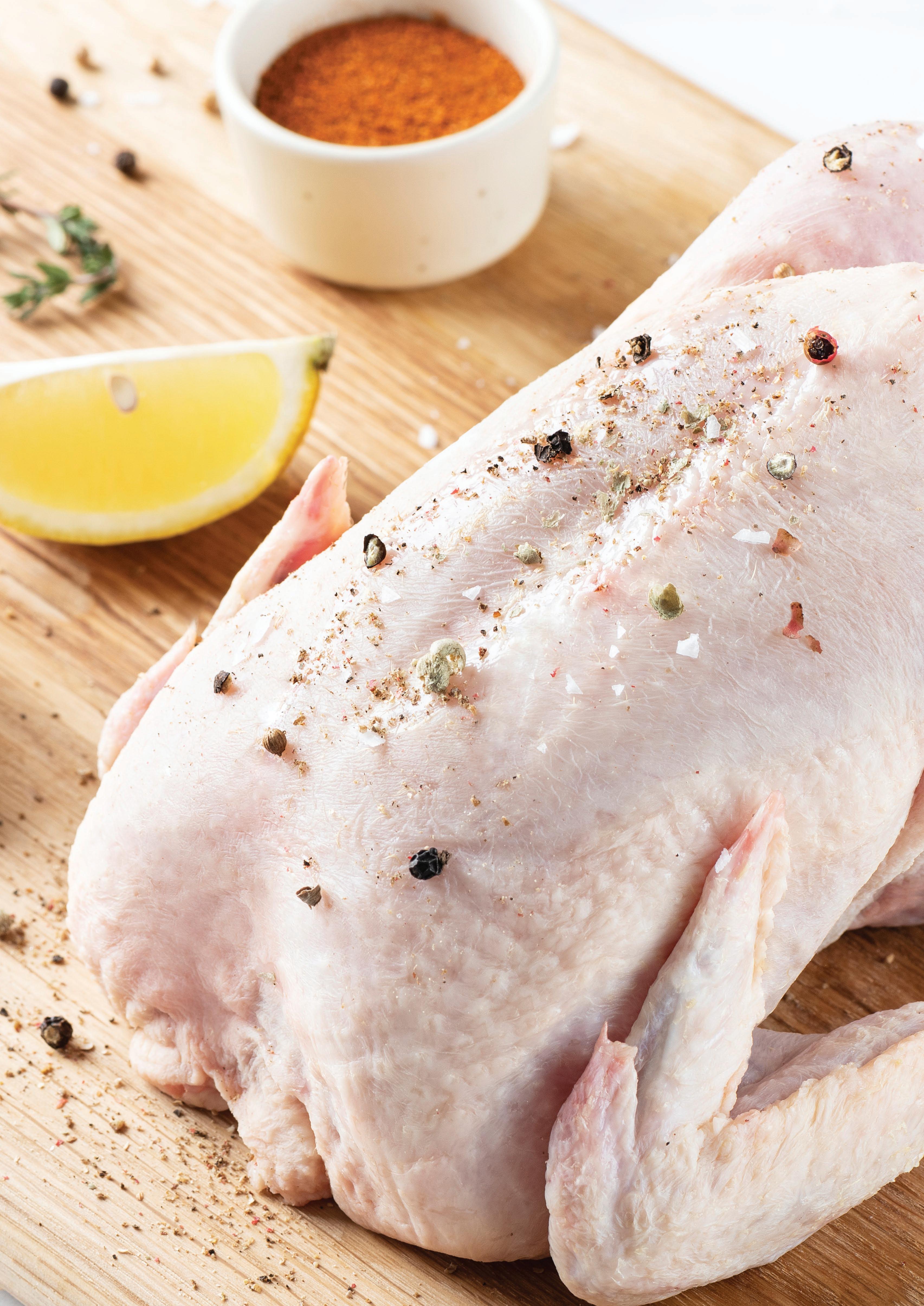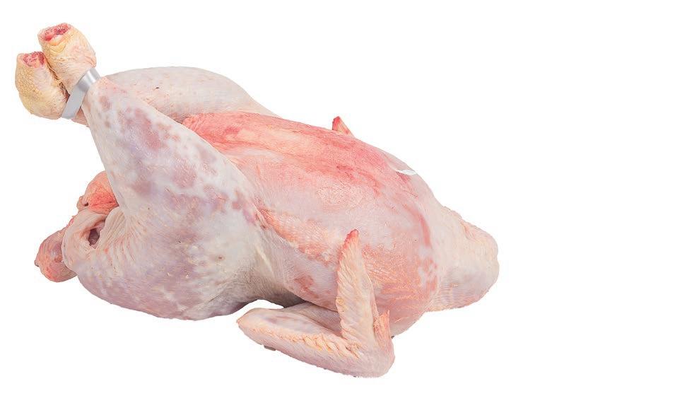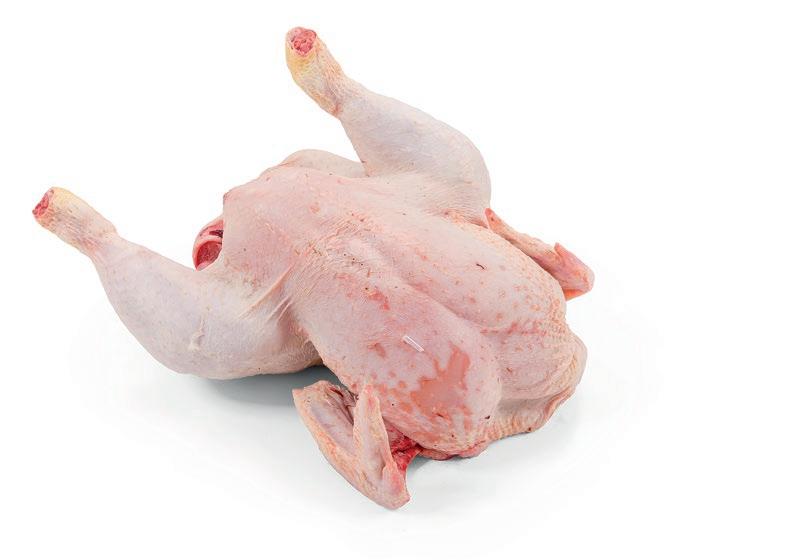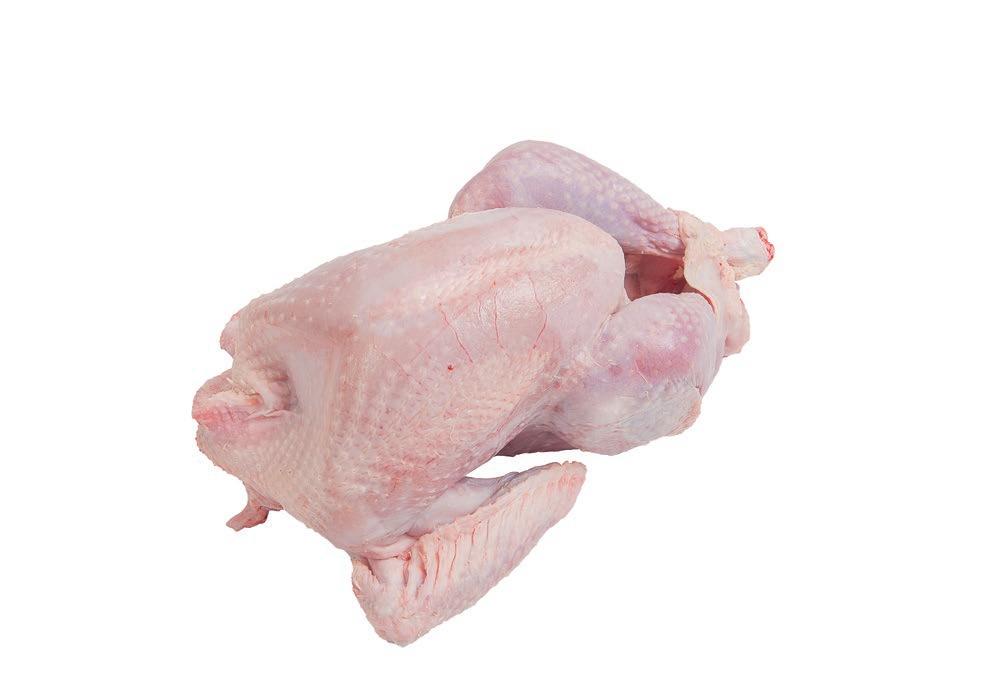Pollo entero con los muslos cruzados, atados con la piel de la cola, sin menudillos.
