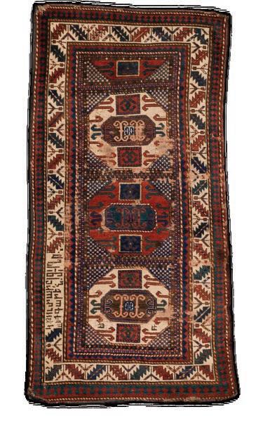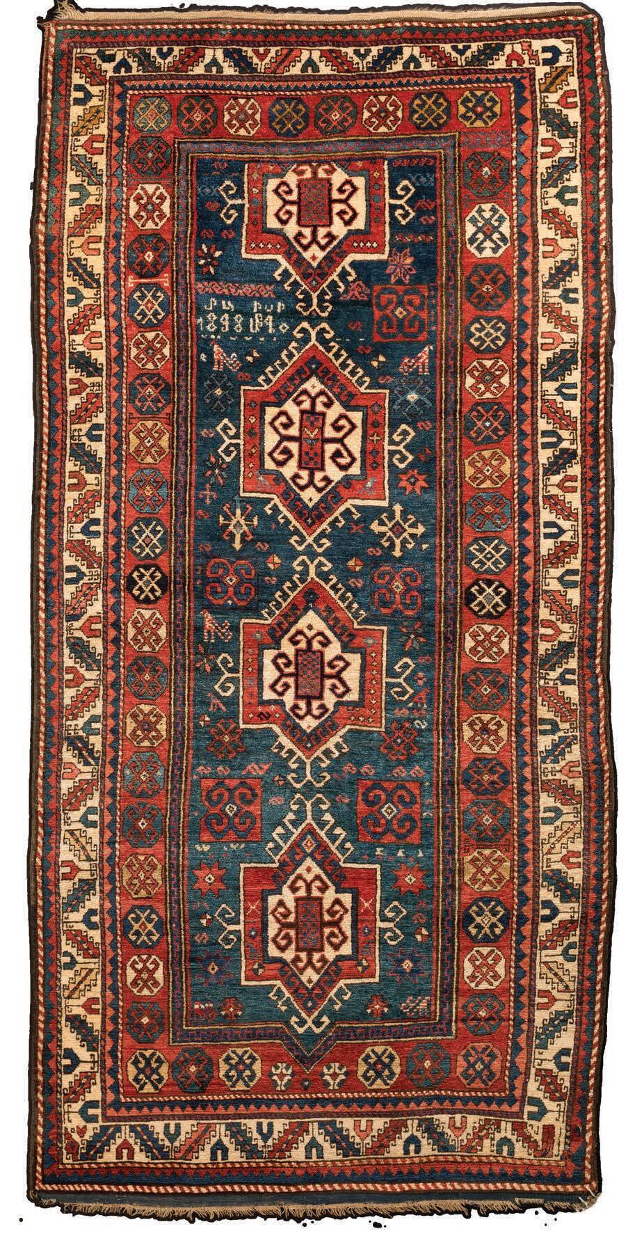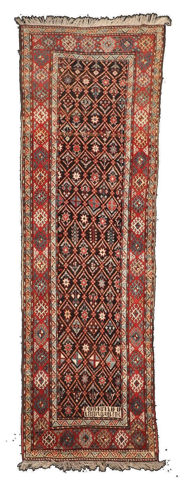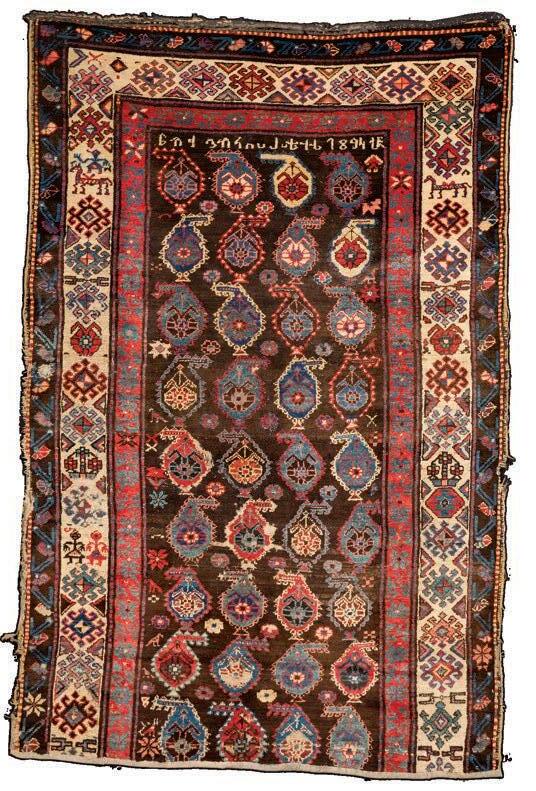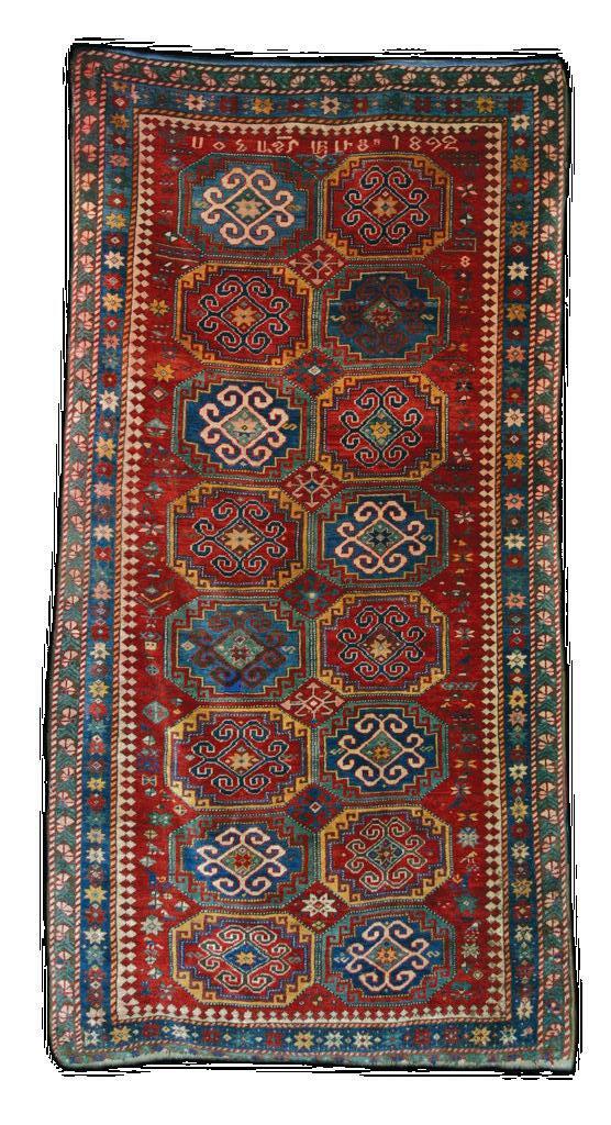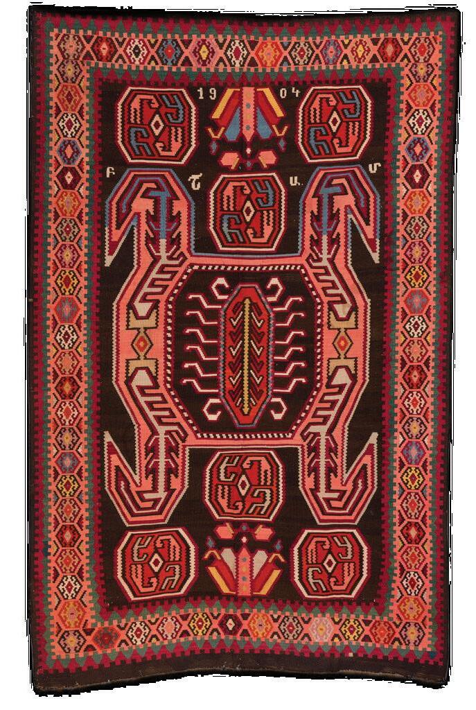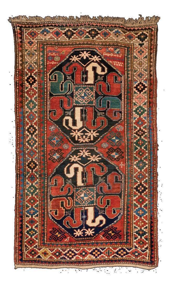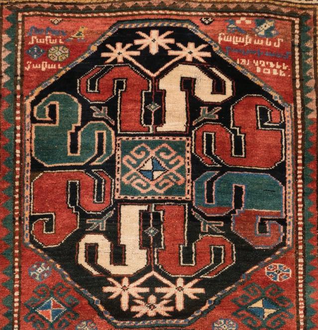 Of particular scientific interest among these is the 1904 rug No. 3645 from the “Guhar” subgroup of late dragon rugs. This piece, notable for its dated Armenian inscriptions, is believed to have been produced in the rug weaving centers of Sisakan.