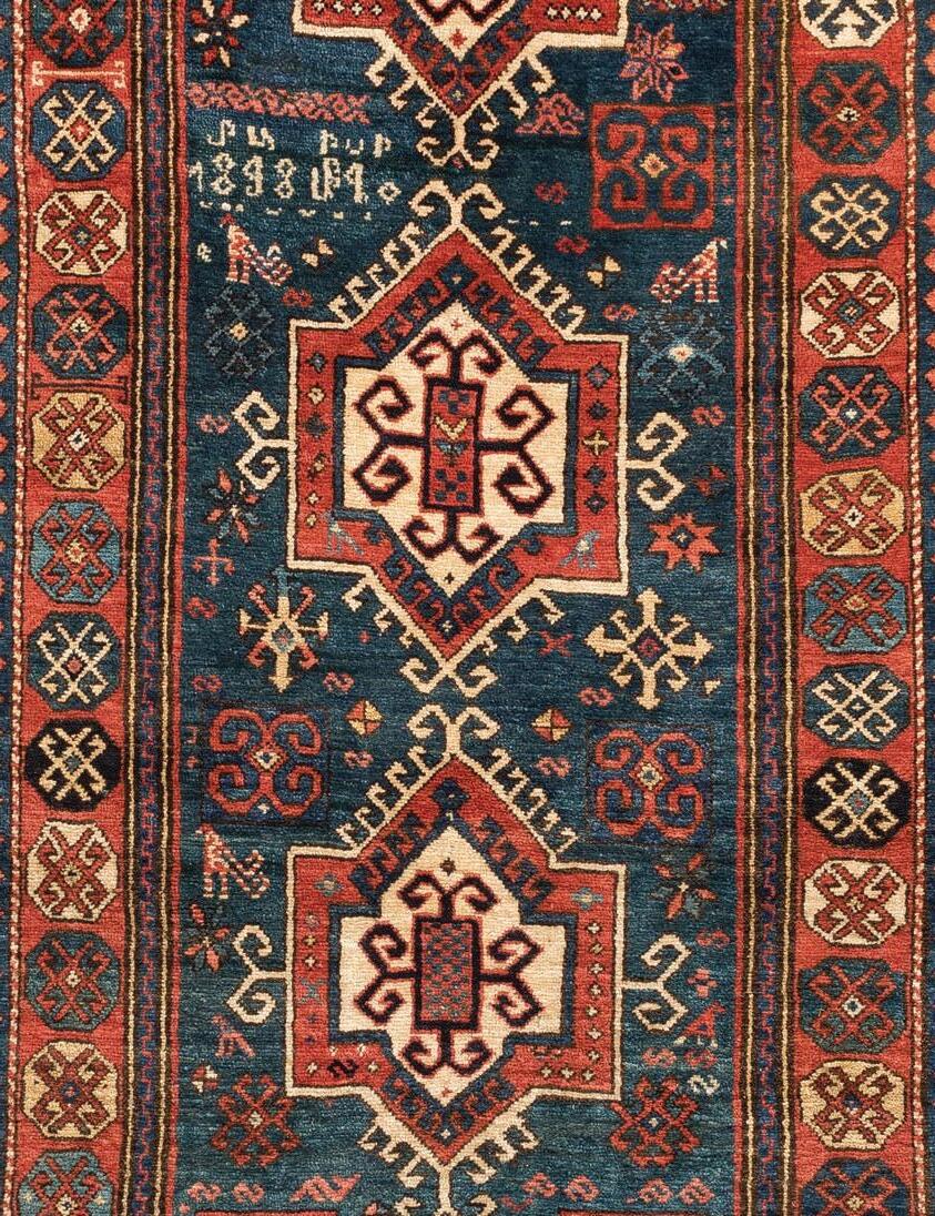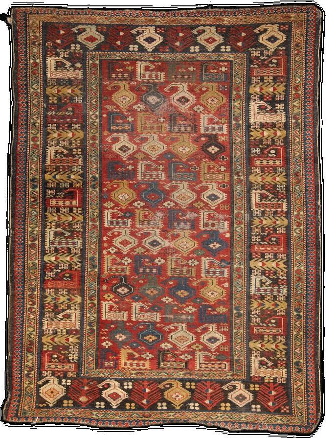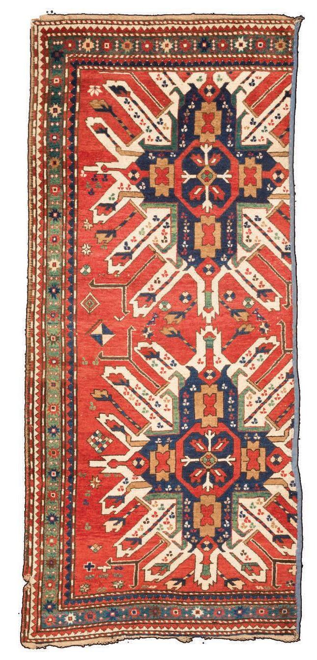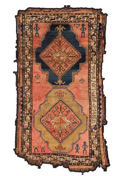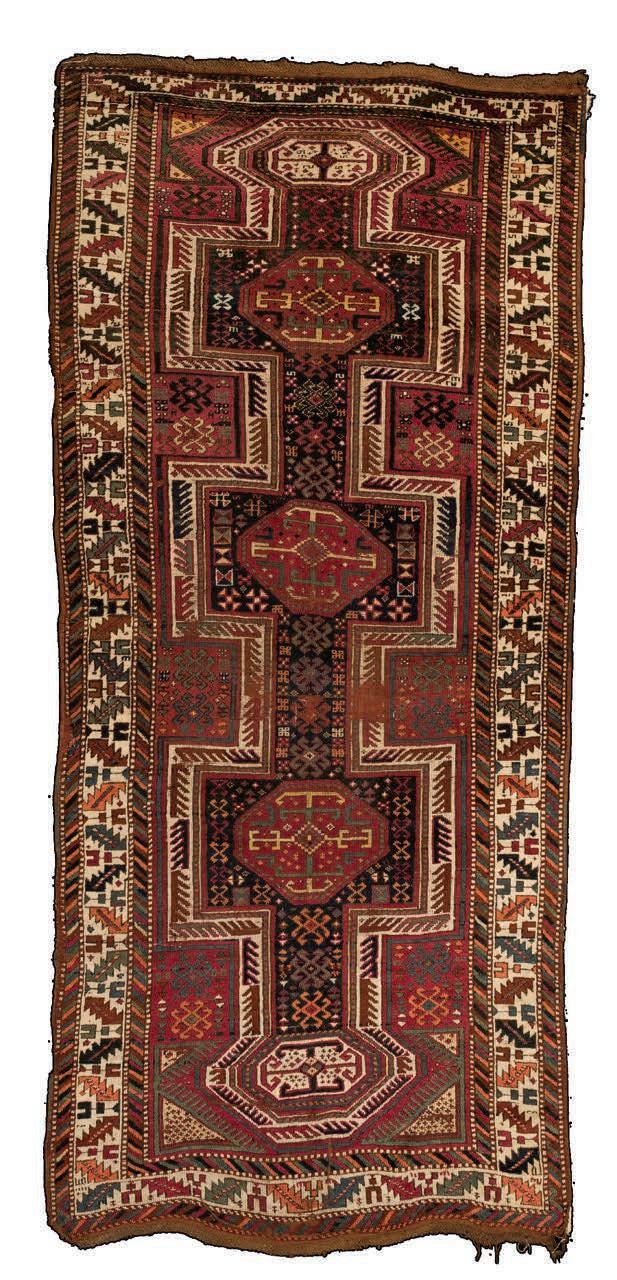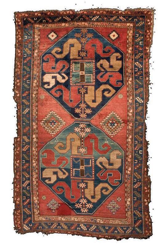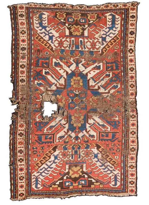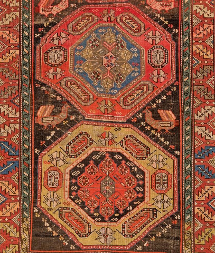 Of particular scientific interest among these is the 1904 rug No. 3645 from the “Guhar” subgroup of late dragon rugs. This piece, notable for its dated Armenian inscriptions, is believed to have been produced in the rug weaving centers of Sisakan.