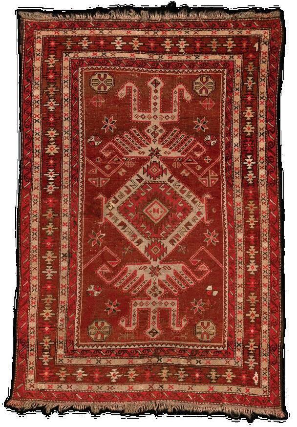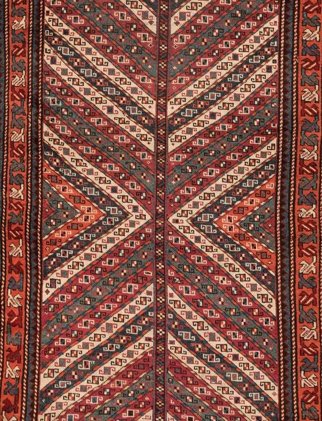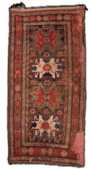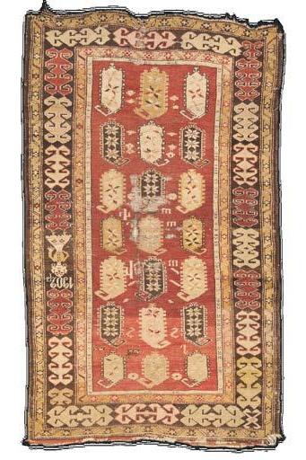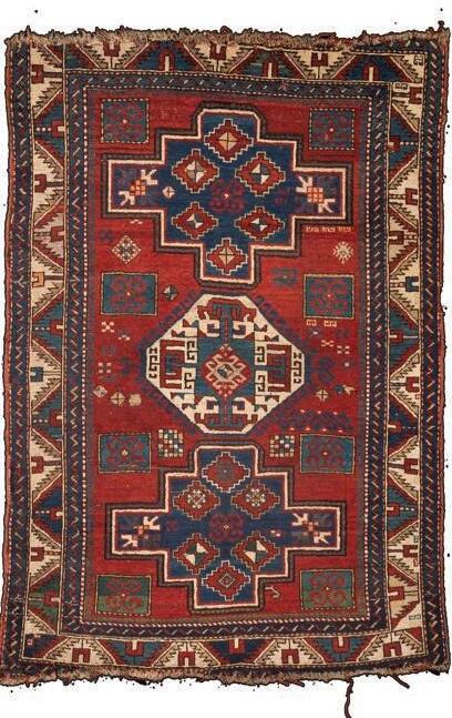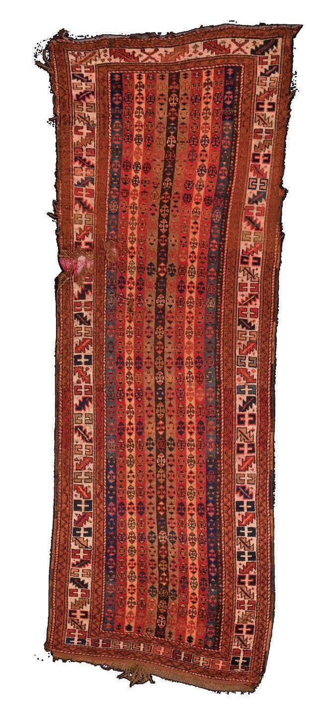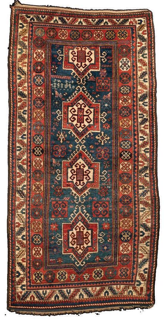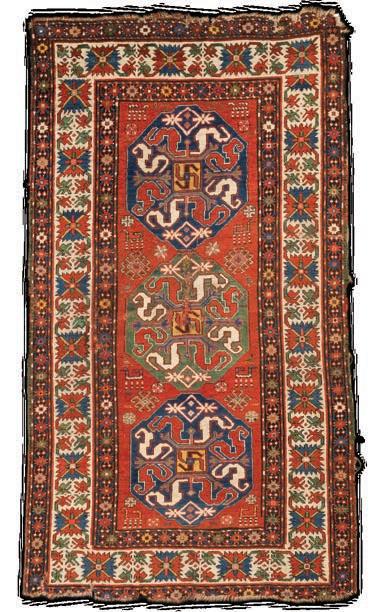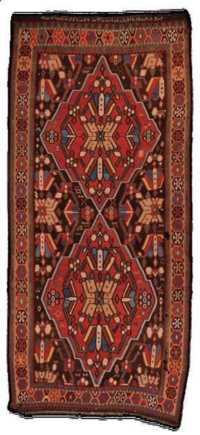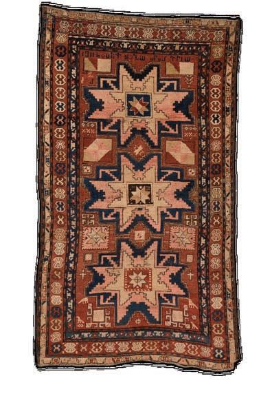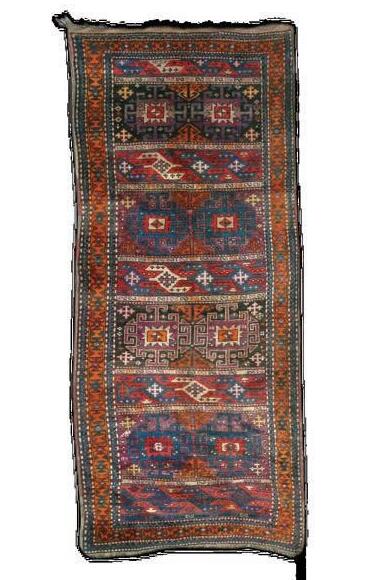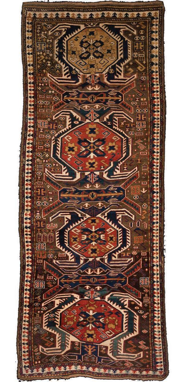 Of particular scientific interest among these is the 1904 rug No. 3645 from the “Guhar” subgroup of late dragon rugs. This piece, notable for its dated Armenian inscriptions, is believed to have been produced in the rug weaving centers of Sisakan.