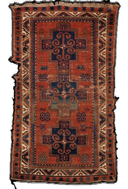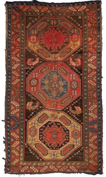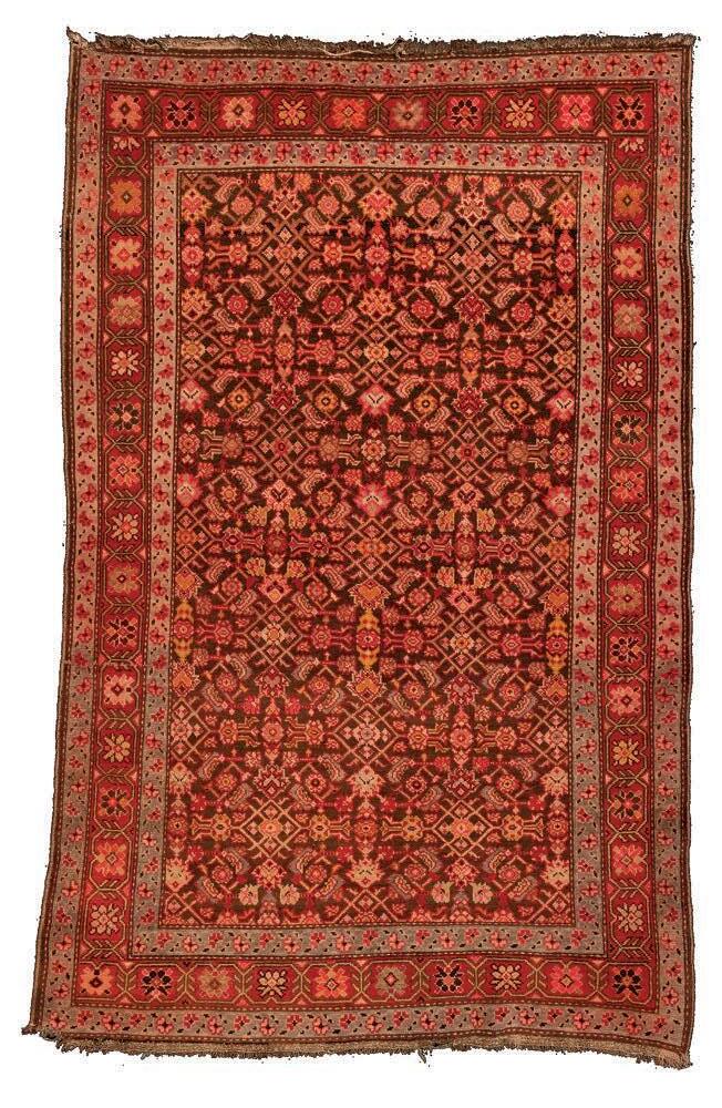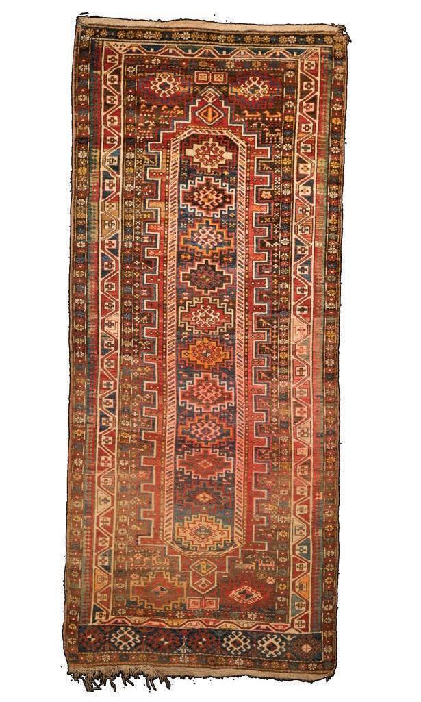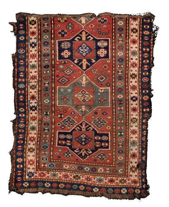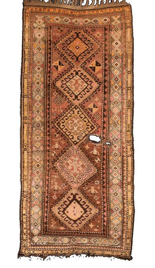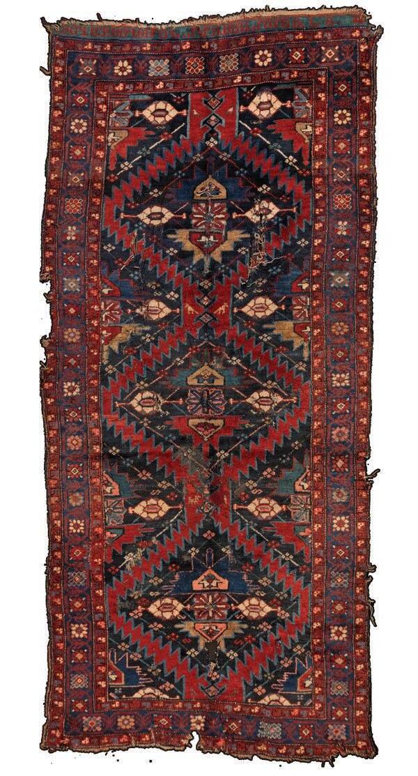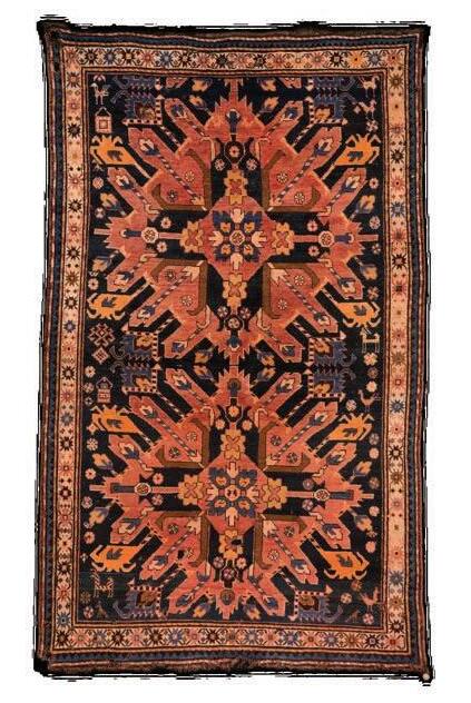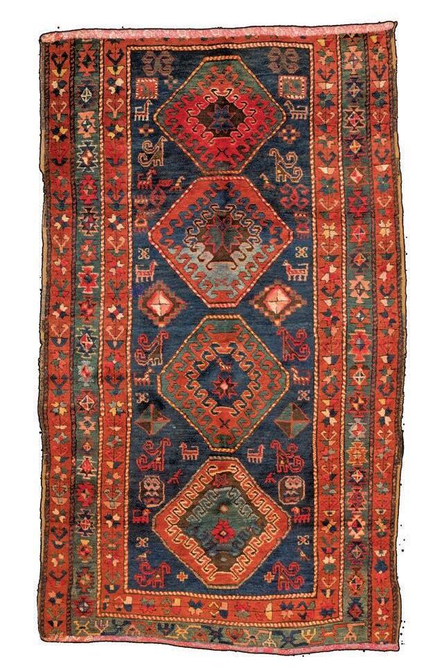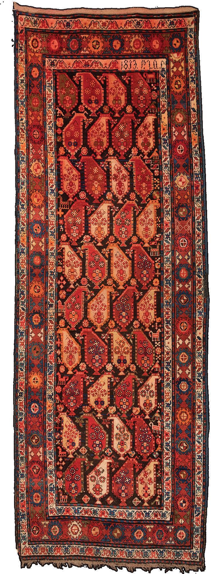 Of particular scientific interest among these is the 1904 rug No. 3645 from the “Guhar” subgroup of late dragon rugs. This piece, notable for its dated Armenian inscriptions, is believed to have been produced in the rug weaving centers of Sisakan.