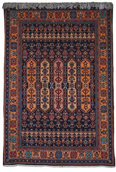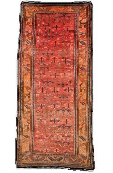 The presented collection includes a large number of rugs from the “Plantfloral” group. This group encompasses rugs with floral ornaments, almondshaped ornaments (boteh), tree motifs, and similar designs. Notably, those adorned with tree motifs stand out. These compositions, whether represented within frames or not, are arranged in regular rows. They are further enhanced