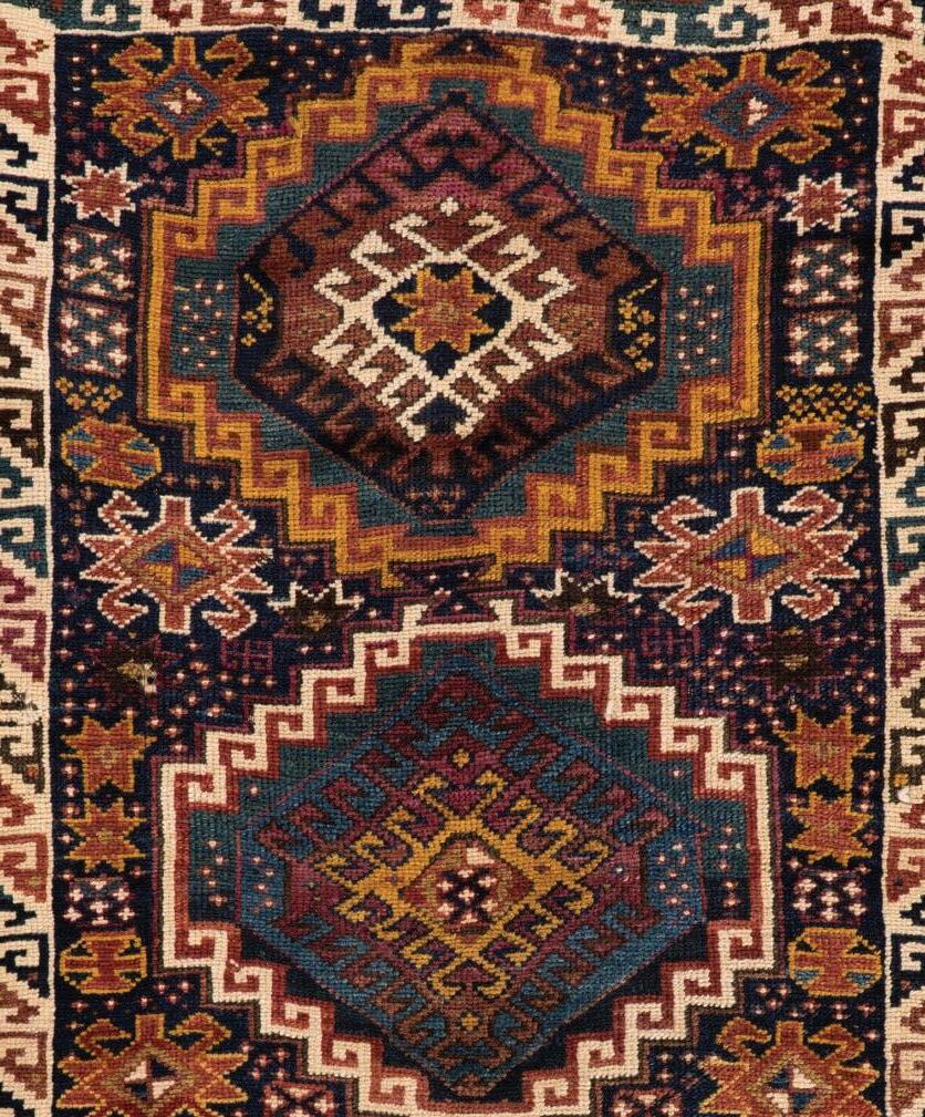 The collection also has rugs characterized by a cross pattern or cross-shaped compositions. Here, a sample belonging to the type characterized by a cross-like axis and shield-shaped composition, known as “Vahan” (shield) or “Sevan-Vahan”, is very unique.
