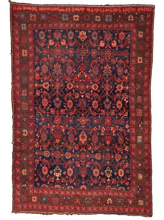 On both edges of the rug field there is a one-line inscription which reads: “AYS KHALICHAN YES KORCECIM HAYKANDUT VARDENESEANC, AYS KHALICHAN YES KORCECIM YEGHSAPET VSENC MARTI 10-IN 1914 (I wove this rug, Haykandukht Vardenesyants, I wove this rug, Yeghsabet Vsents, on March 10, 1914)”.
