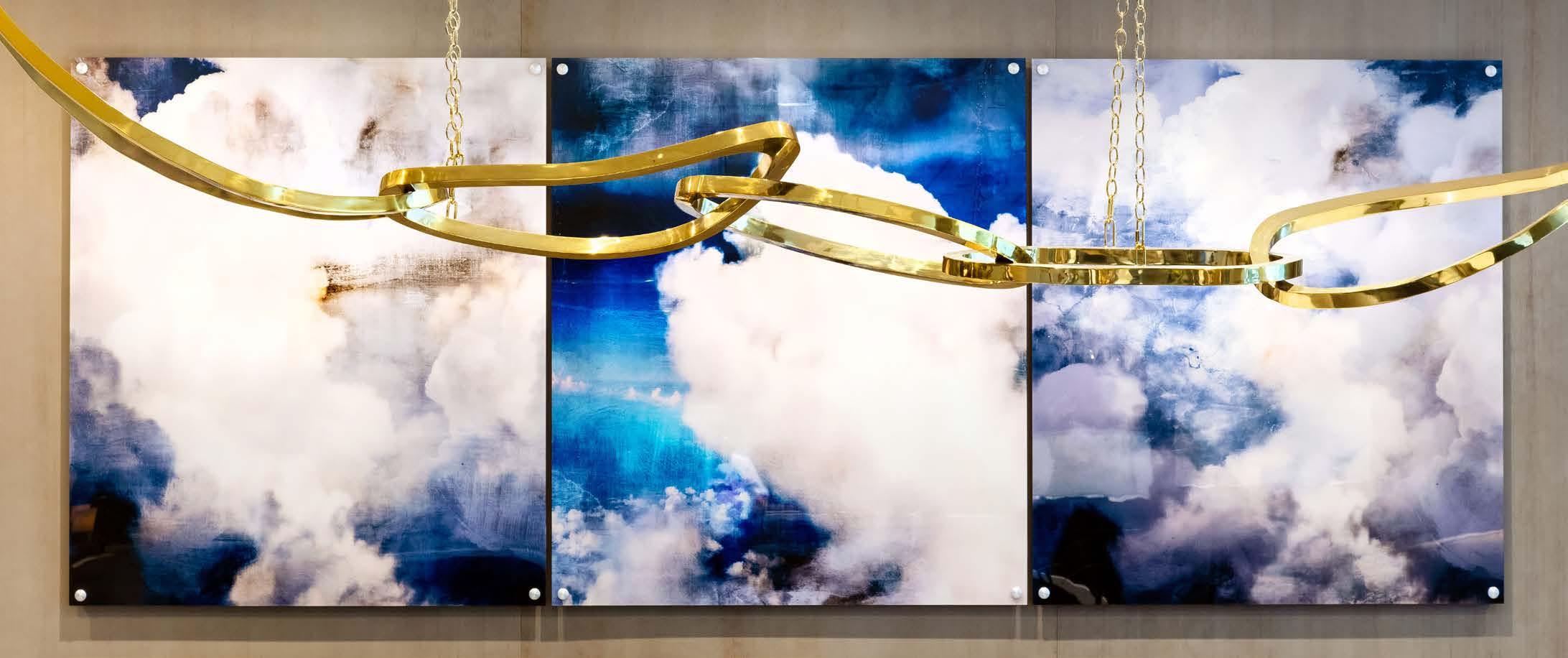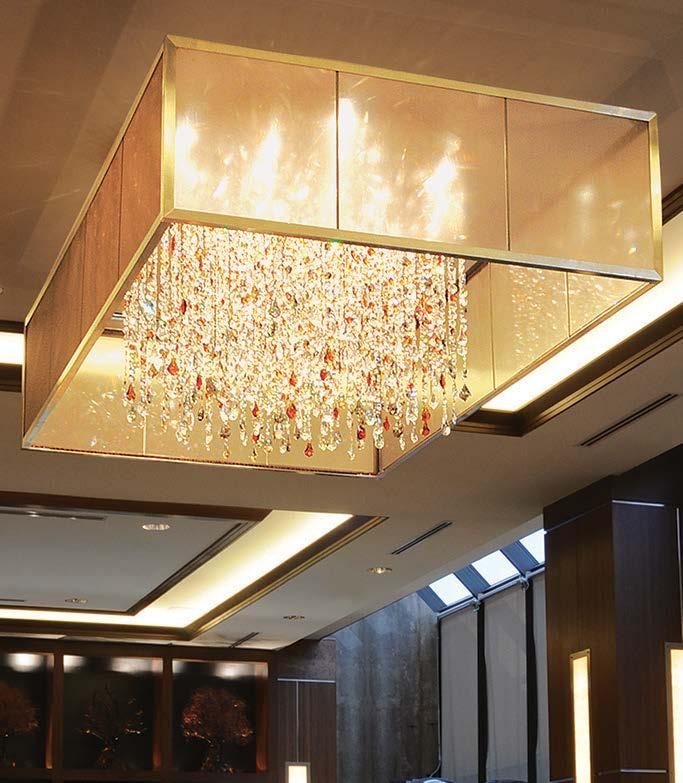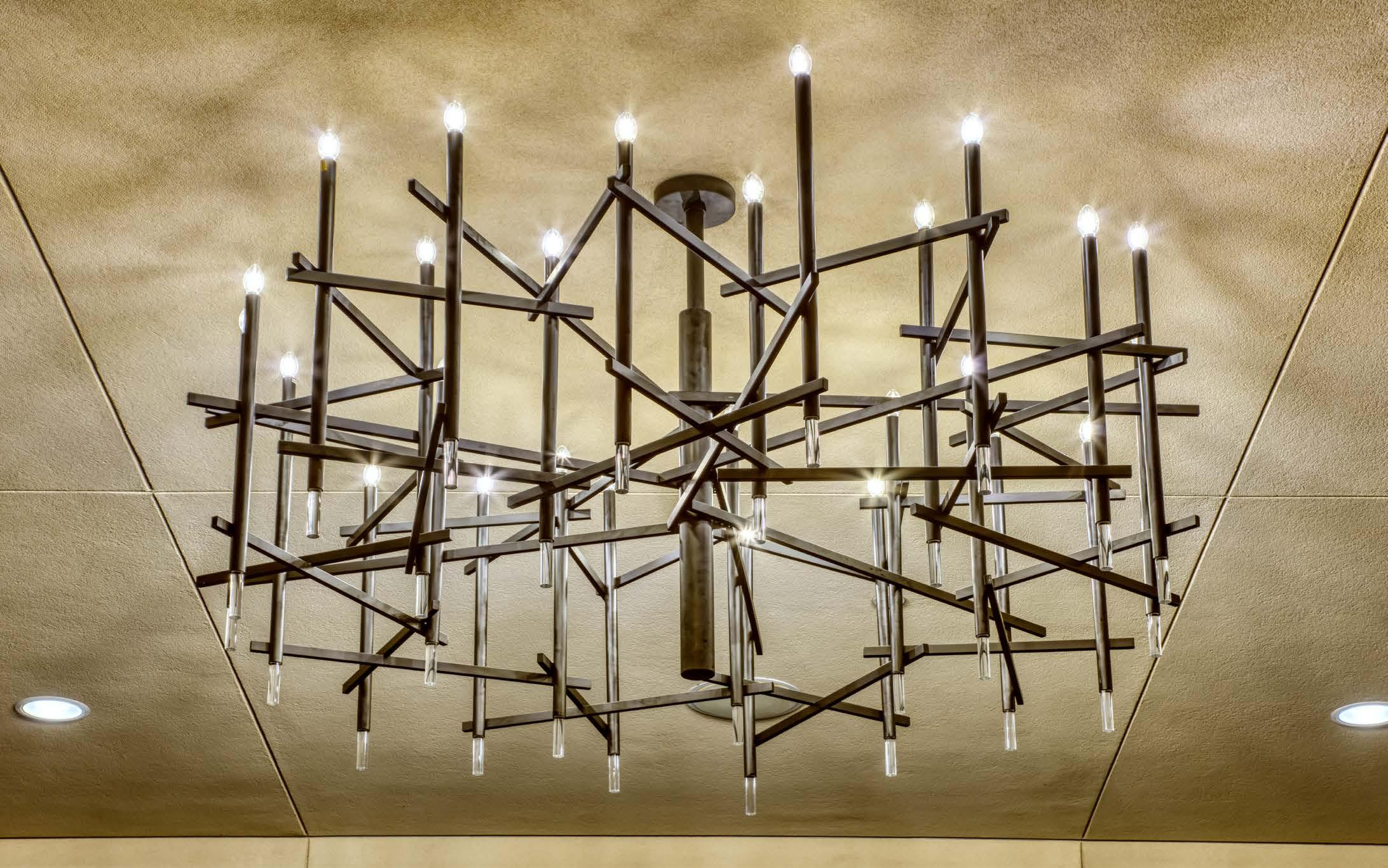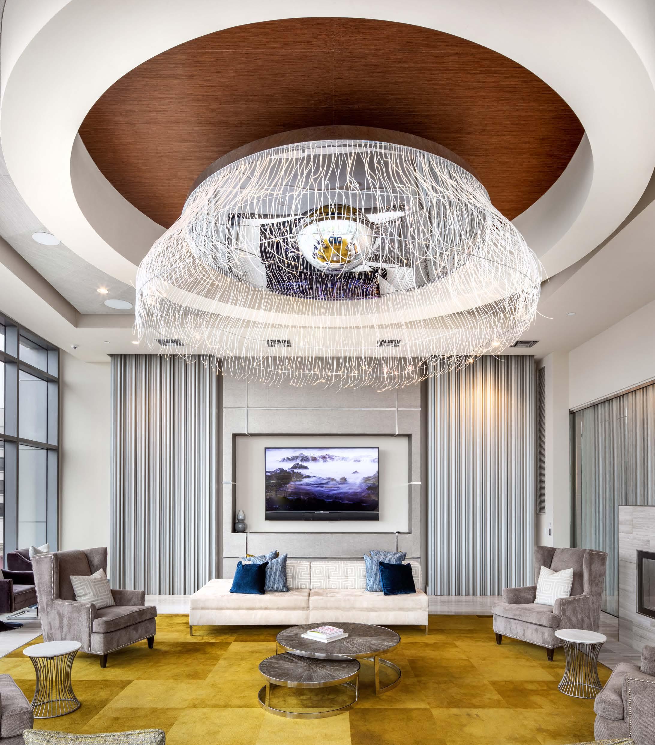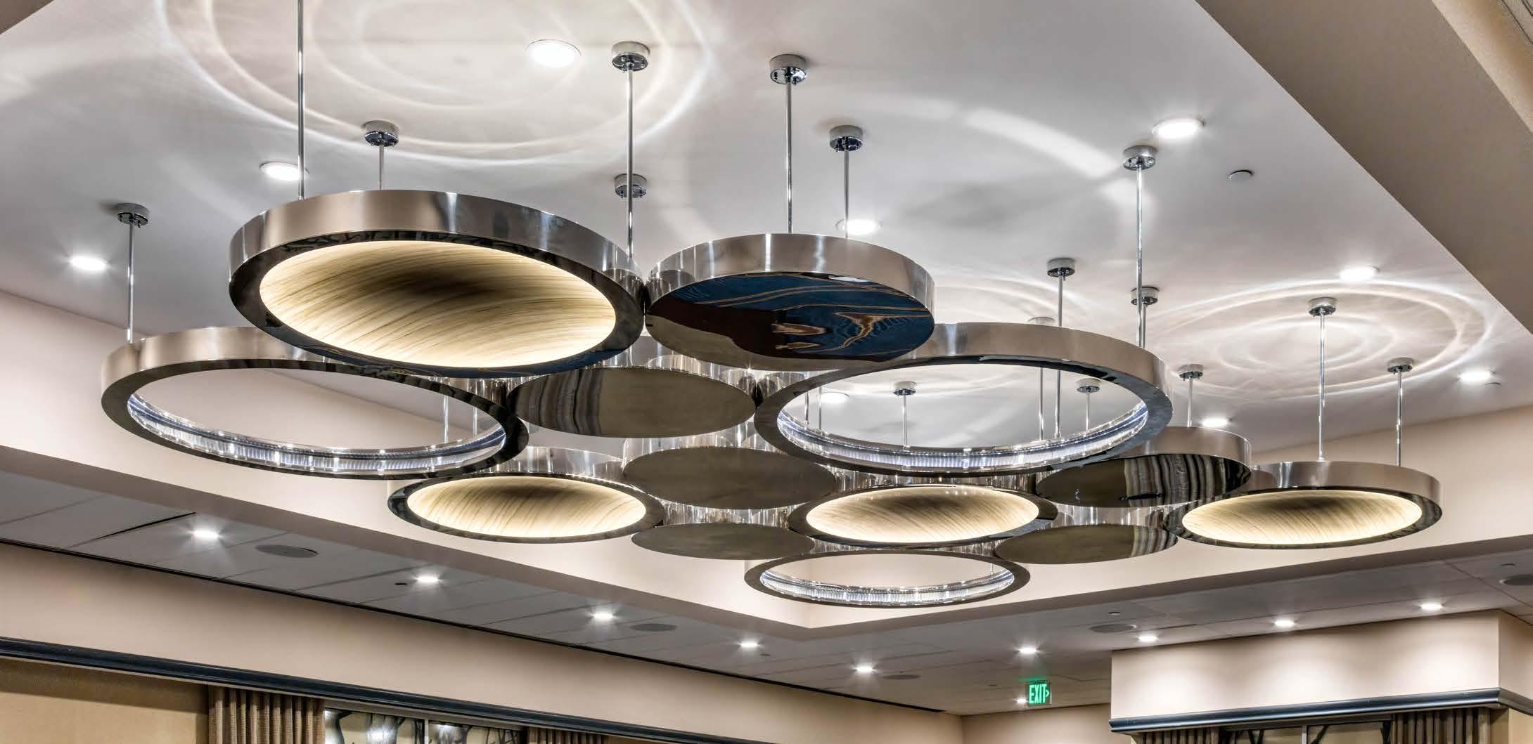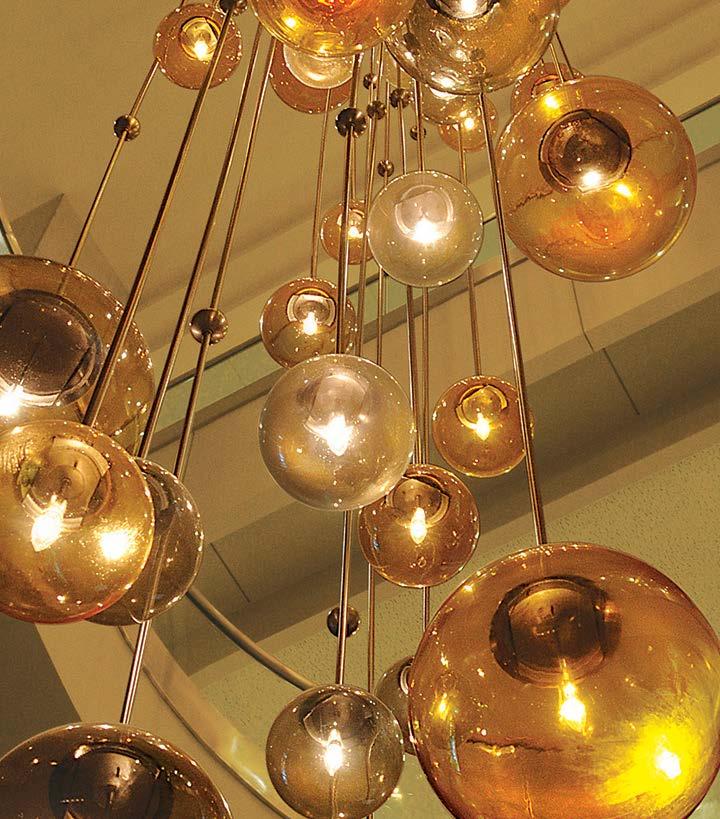 Add a breath of brilliance to your design vision. Interlocking, downlit brass rings and statuesque torchieres define the expansive lobby with sculptural elegance. Overhead, sumptuous clusters of glass bubbles in clear champagne and warm amber create the illusion of floating, illuminated grandeur.