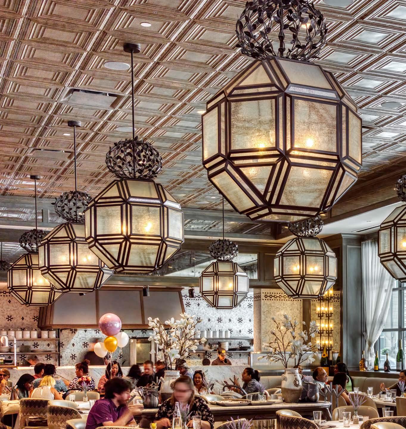 French Deco–inspired lanterns in aged dark bronze and seeded glass, crowned with whimsical leaf detailing, promenade gracefully throughout this delightful dining space.