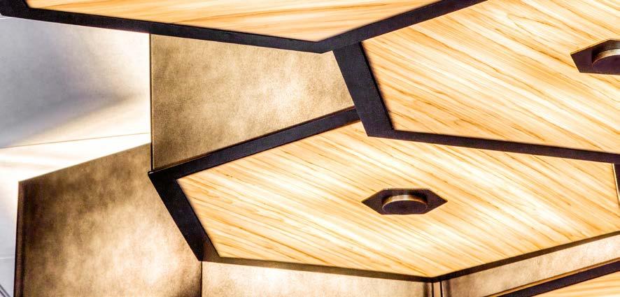Simplicity of form and disciplined repetition, elevated through the thoughtful use of luxe materials, define the character of this refined hospitality space. A rhythmic series of coffers housing softly glowing, hand-finished faux alabaster “hatboxes” creates architectural continuity overhead.