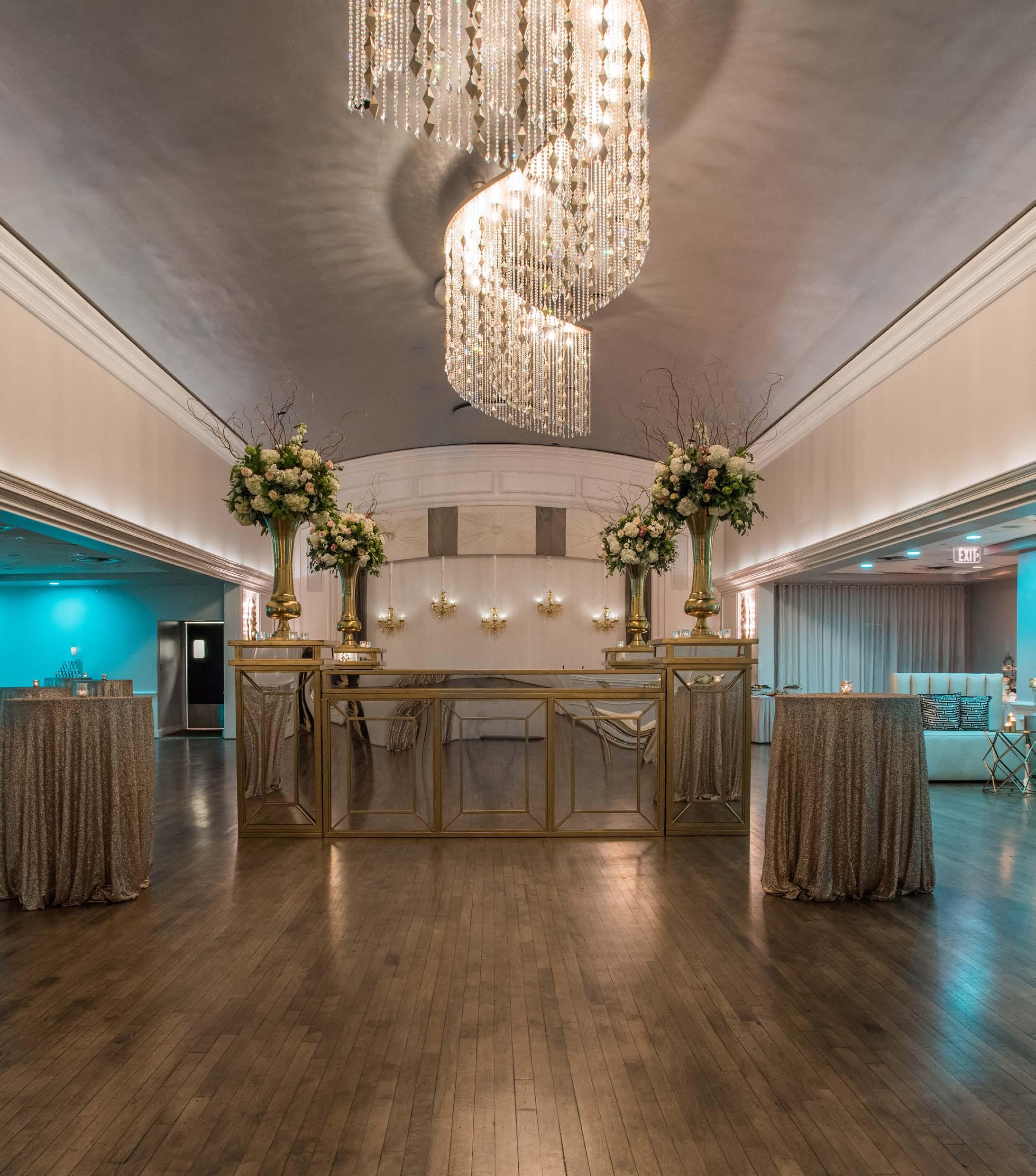 A delightful renovation transforms this intimate ballroom into a study in refined glamour. A serpentine installation of crystal strands accented with brass diamonds shimmers within a perfectly illuminated coffer. Statement sconces featuring larger diamond-shaped “shield” shades complete the composition, creating charming Deco-inspired drama and timeless sophistication.