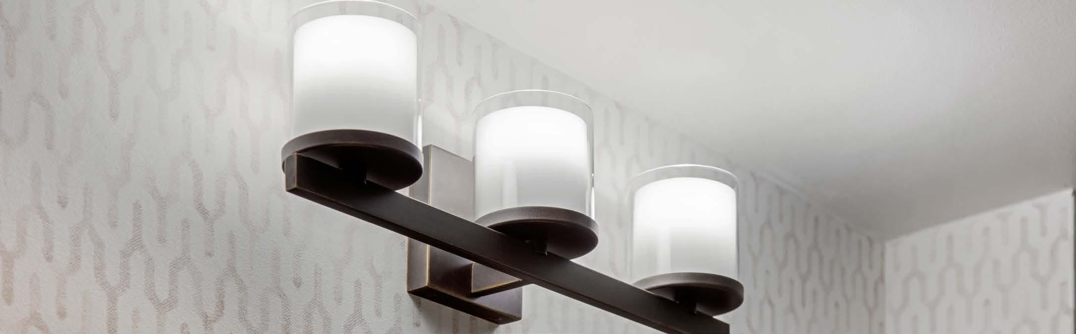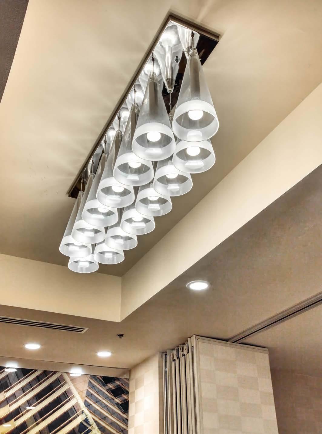 Interlocking rings with integrated LED strips and triangular trios of T-lamps hover overhead, creating a dynamic architectural rhythm. A thoughtful blend of cove illumination and wall-grazing pools of light adds depth and dimension, elevating everyday circulation areas into refined, visually engaging environments.