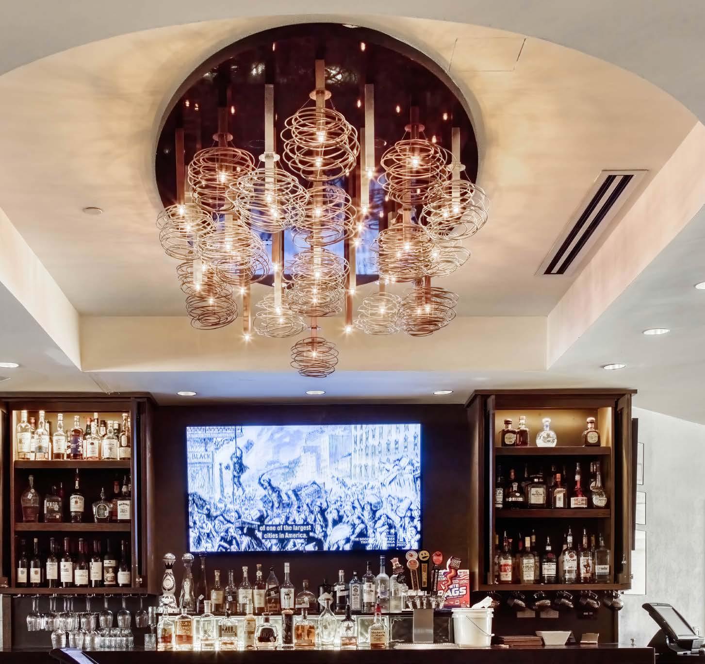 Gentlemen’s club–inspired dining areas introduce layered sophistication, with tiered pendants and coordinating sconces repeating throughout to create visual continuity. Even the stacks of illuminated “books” add a curated touch, striking the perfect balance between grandeur and invitation in this timeless Houston landmark.