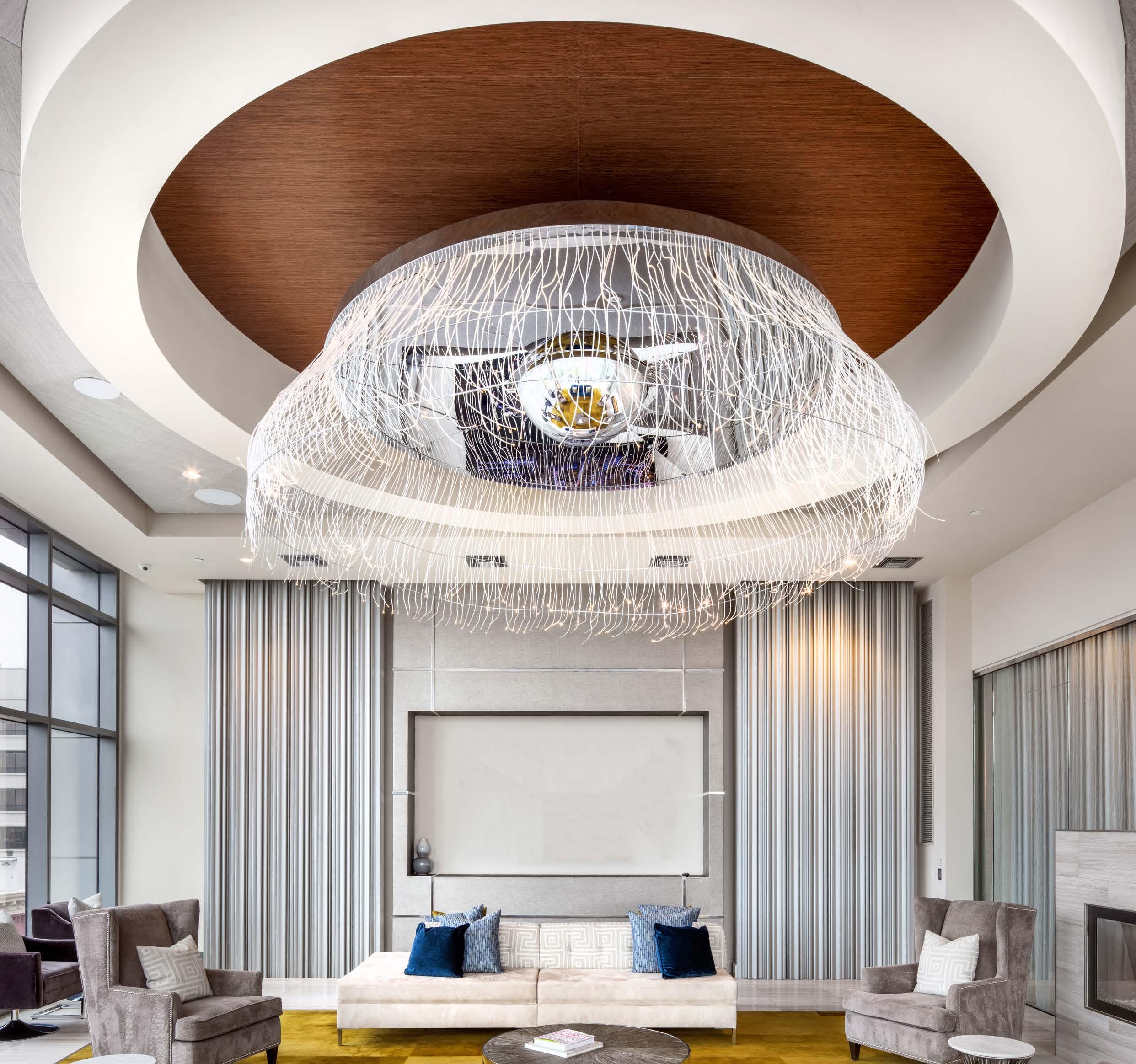 An ethereal ring of LED fibers encircling a central silvered mirror lamp appears to float within a striking curved coffer, creating a luminous architectural focal point. In the wood-paneled corners, clusters of smoked glass trapezoids cast a warm glow, introducing depth and dimension to the cool, contemporary lobby of these luxury downtown Houston residences.