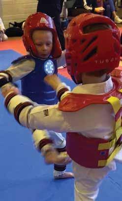 Dominic (in blue ) kicks his way to a medal in the peewee competition.