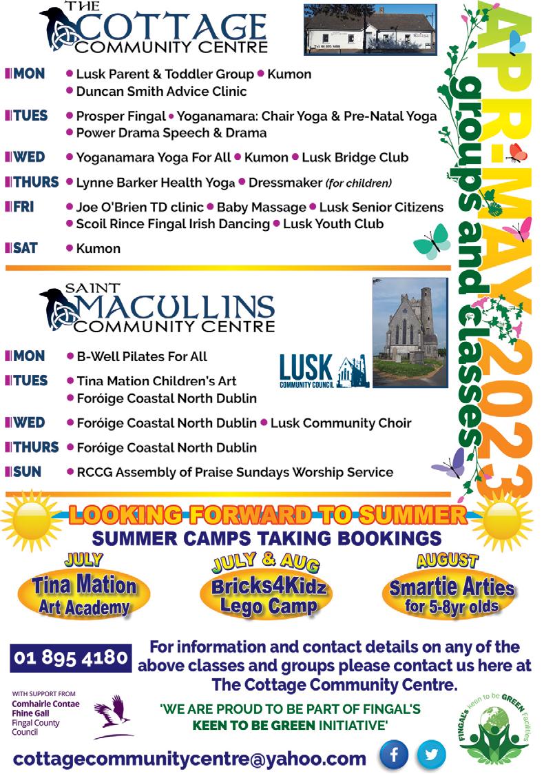 3 LUSK LOCAL-MAY 2023 Contact us: communitylocalseditor@gmail.com Our Team Local News Editor E. communitylocalseditor@gmail.com Advertising Sean Maguire T. 087 915 9052 E. seanmaguire@irishmediagroup.ie Production Tim Evans E. communitylocalsdesigner@gmail.com Contact us: Lusk Local Magazine Email: communitylocalseditor @gmail.com www.facebook.com/LuskLocal Designated Pick up Points: Supervalu Lusk Costcutters (The Village Store) Tesco, Rush Lidl Lusk IRISHMEDIAGROUP publishing | design | print | web Published by www.irishmediagroup.ie Lusk Local Disclaimer Every effort is made by Lusk Local Magazine to ensure that the information is correct and will not be held responsible for any advertisement errors. Lusk Local reserves the right to decline, suspend or omit any advertisement or article submitted. No liability can be accepted by Lusk Local for any printing errors in advertisements or otherwise. STRICT DEADLINE FOR NEXT EDITION: Submissions by the 15th for inclusion in next months edition Email: Robert.ODonoghue@cllrs.fingal.ie Call: 083 054 5554