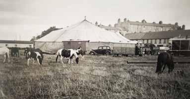 Then at long last the great day arrived. Even though it was early there were children on The Green patiently waiting to get the first glimpse of the cavalcade as it turned the corner and came down New St. Other children who wanted to be the first to see it waited on the Railway Bridge. Then we heard the noise of horses’ hooves in the distance and gradually it got louder until the first horse-drawn wagon turned down New St. to be followed by what seemed an unending line of horse-drawn caravans. And then the lorries pulling equipment and heavier caravans followed. One by one they went up onto The Green and found their place. Soon some 50 to 60 horses brown/white, black/white were grazing contentedly. We watched the feverish activity as the Big Top was raised. If the tide was full in the