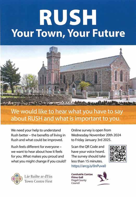 As part of Fingal County Council’s Town Centre First Initiatives in Rush, we are currently inviting residents, community groups, businesses, and other stakeholders within the town to take part in the attached online survey to have their say on the benefits of living in Rush, and how the town could potentially be improved. This short online survey is now open for completion until Friday 03 January 2025.