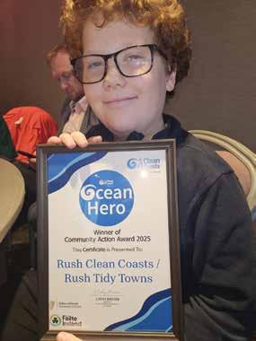 Rush Tidy Towns was honoured with the Clean Coasts Community Action Award for its outstanding efforts to protect and enhance our beaches. From planting Marram Grass to organising clean-ups and promoting sustainable beach use, these initiatives have helped preserve the natural beauty of our coastline. This award is a testament to the hard work of volunteers and the community spirit that drives these projects.