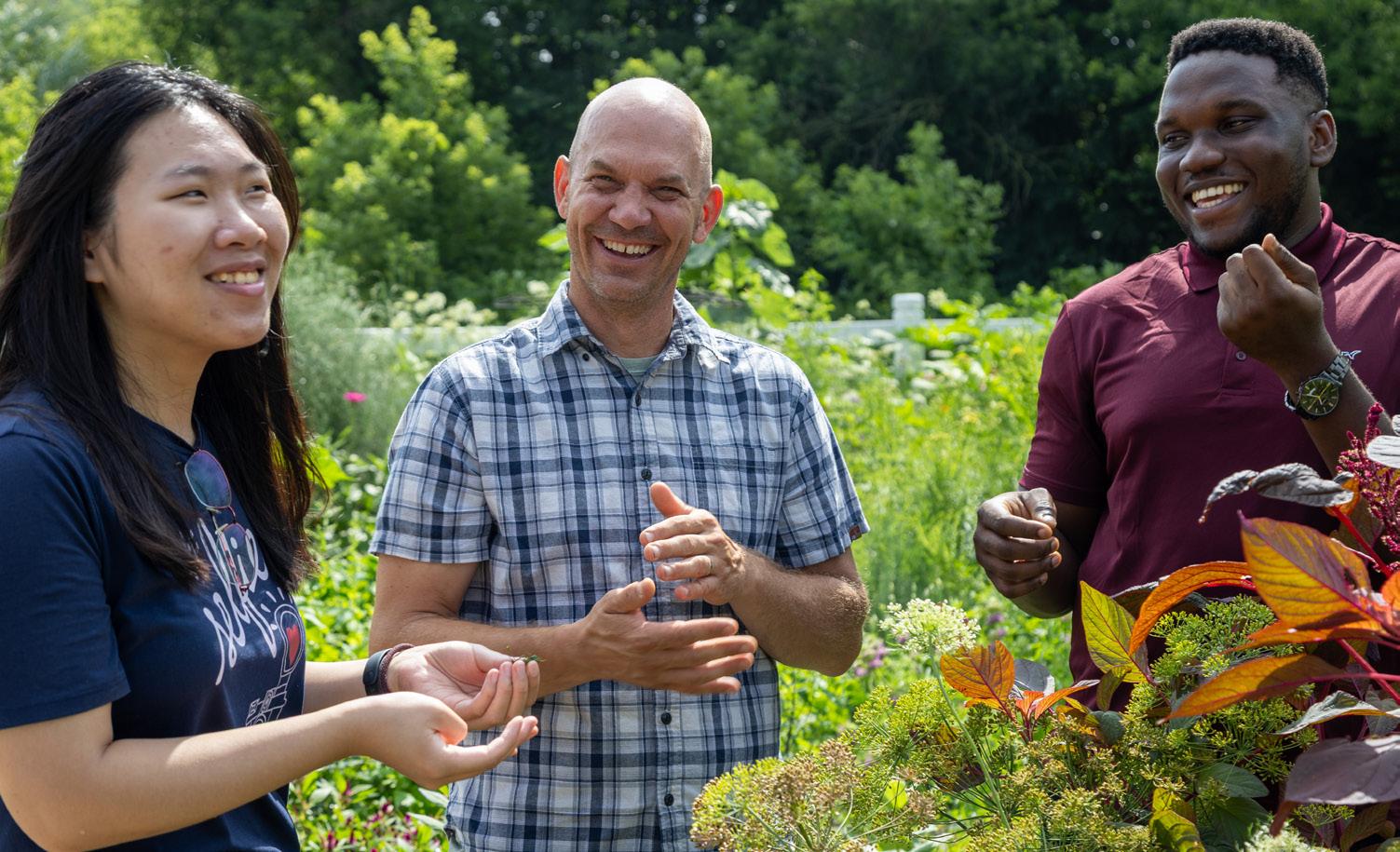 Over the summer, students Linh Nguyen ’27 (left) and Armel Donfack ’26 (right) conducted research with associate math professor Phil Iversen ’87 to analyze e-commerce data for Seed Savers Exchange (SSE), a Decorah nonprofit directed by Mike Bollinger ’02 (center).