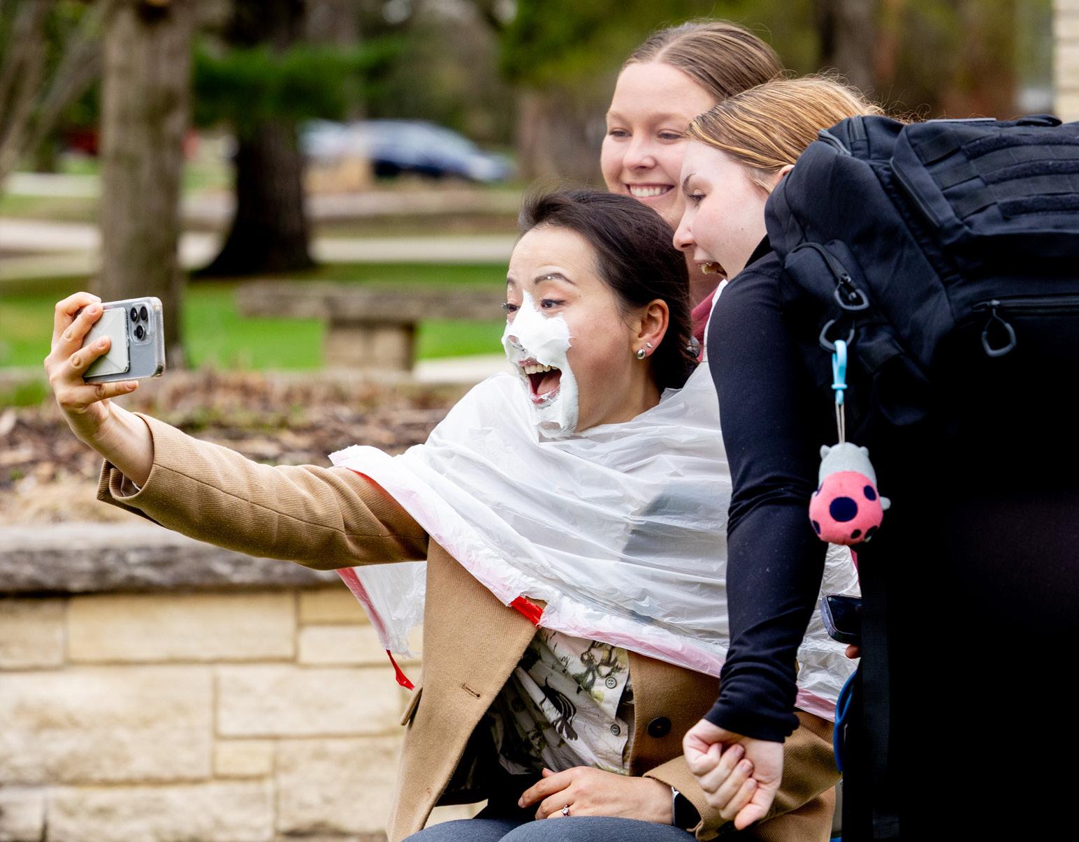 At the Tau Delta Gamma Carnival Bash on April 25, students could buy a chance to pie a professor. Hongxiao Yu (center), assistant professor of management, had too much fun to resist taking a selfie.