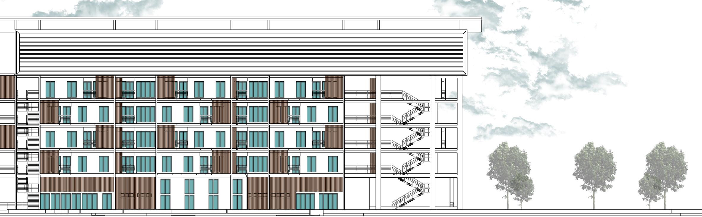 above — The building facade with a grid-like structure accented by vertical wooden slats. with open sections reveal balconies with greenery and people inside. The design emphasizes openness, natural light, and integration with nature.