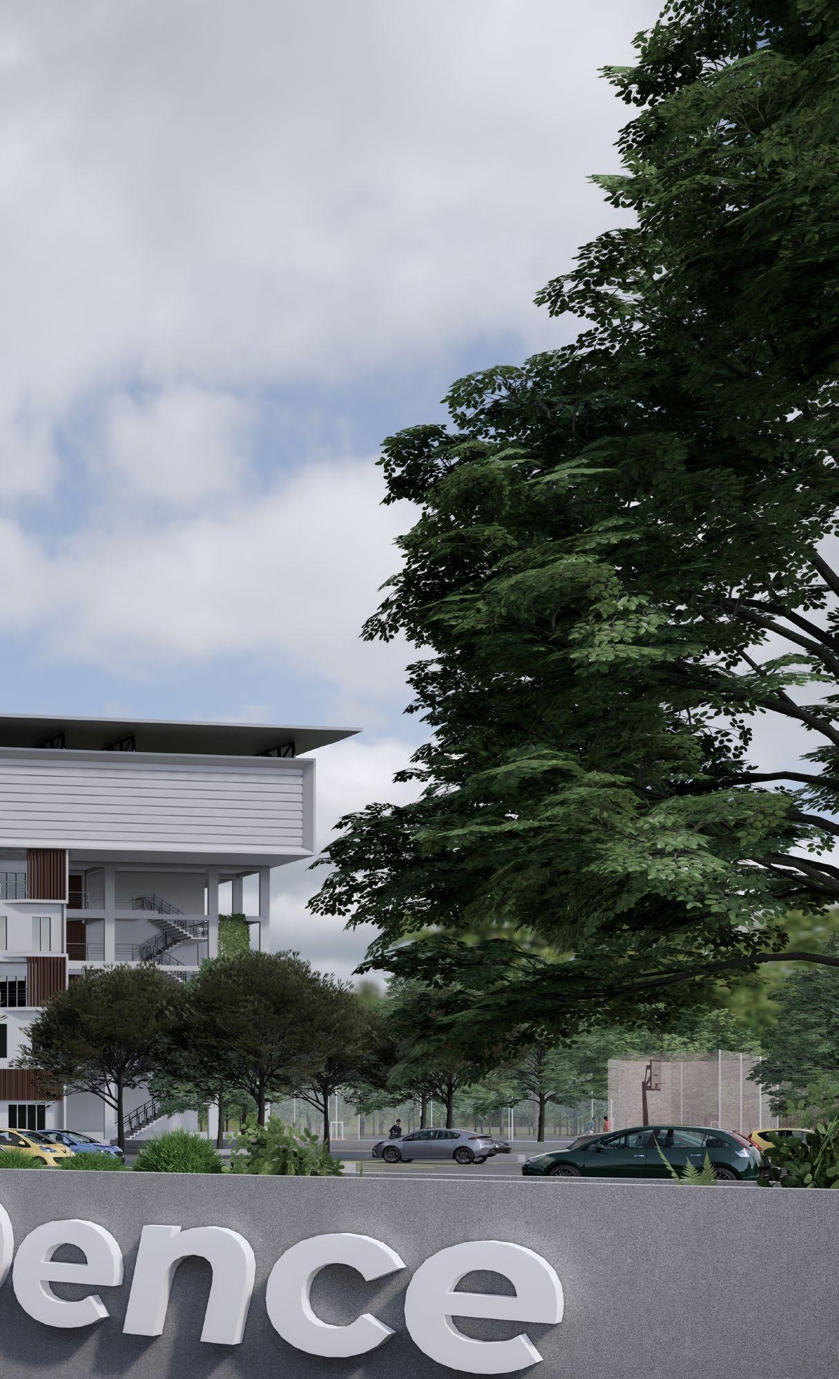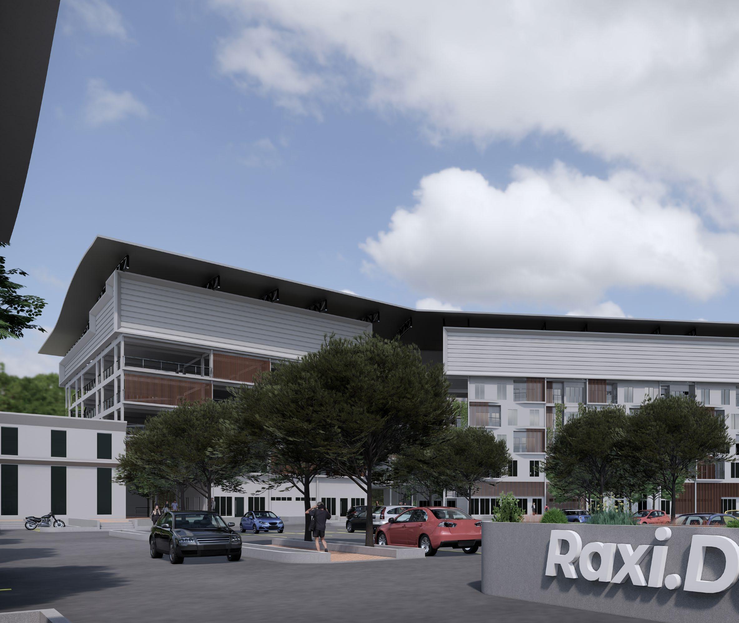 left — The Raxi.Dence features dynamic angular rooflines, a layered facade with louvers and glazing for climate control, and seamless indoor-outdoor integration, creating a modern, contextually responsive architectural statement.