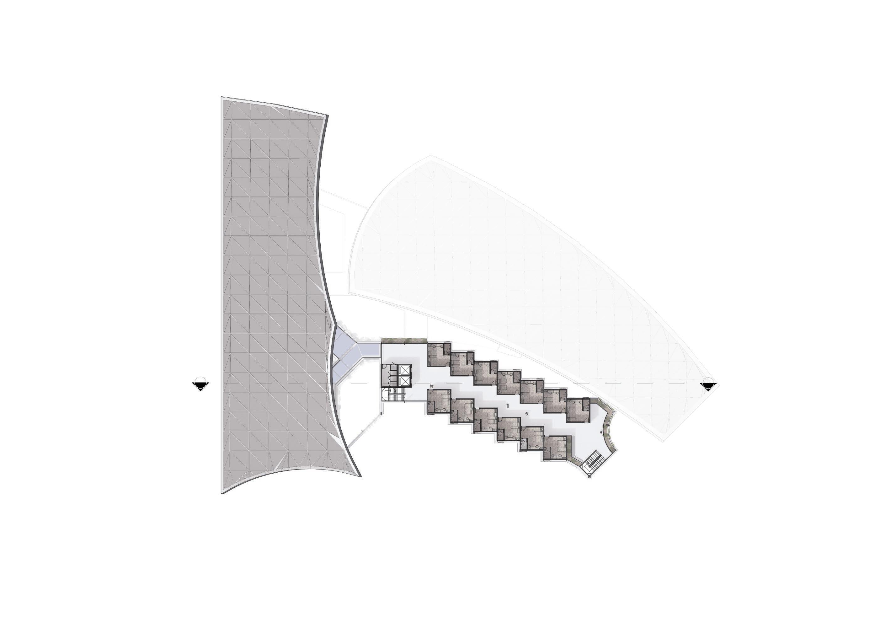 next — The student’s housing features a dynamic, undulating roofline that follows an organic form. Vertical and horizontal grid lines used for design alignment and structural analysis.