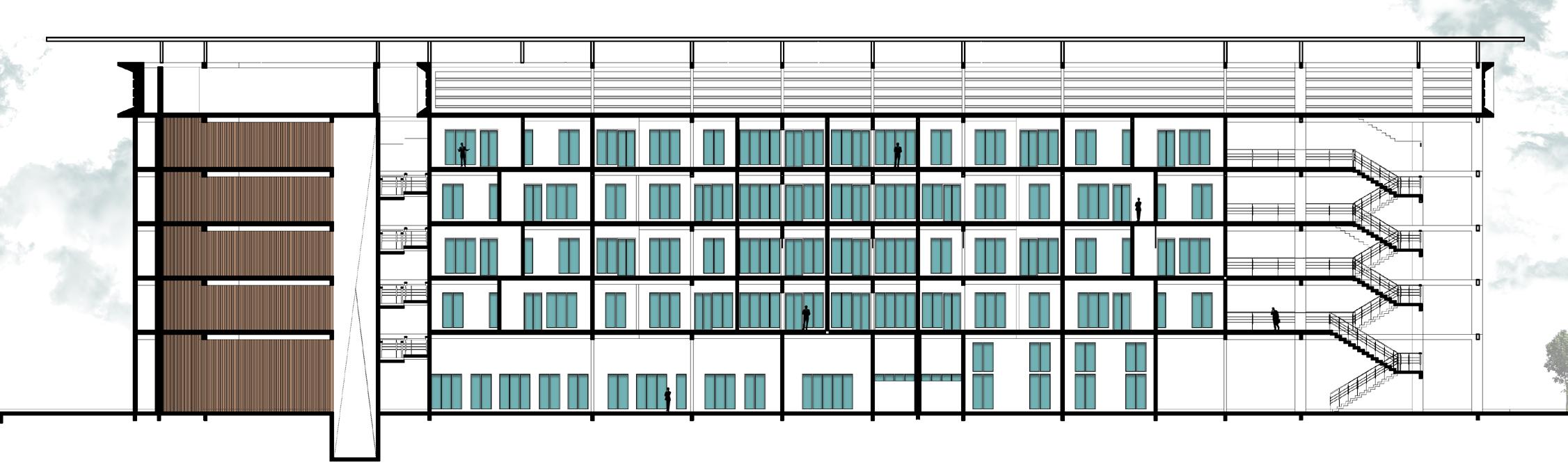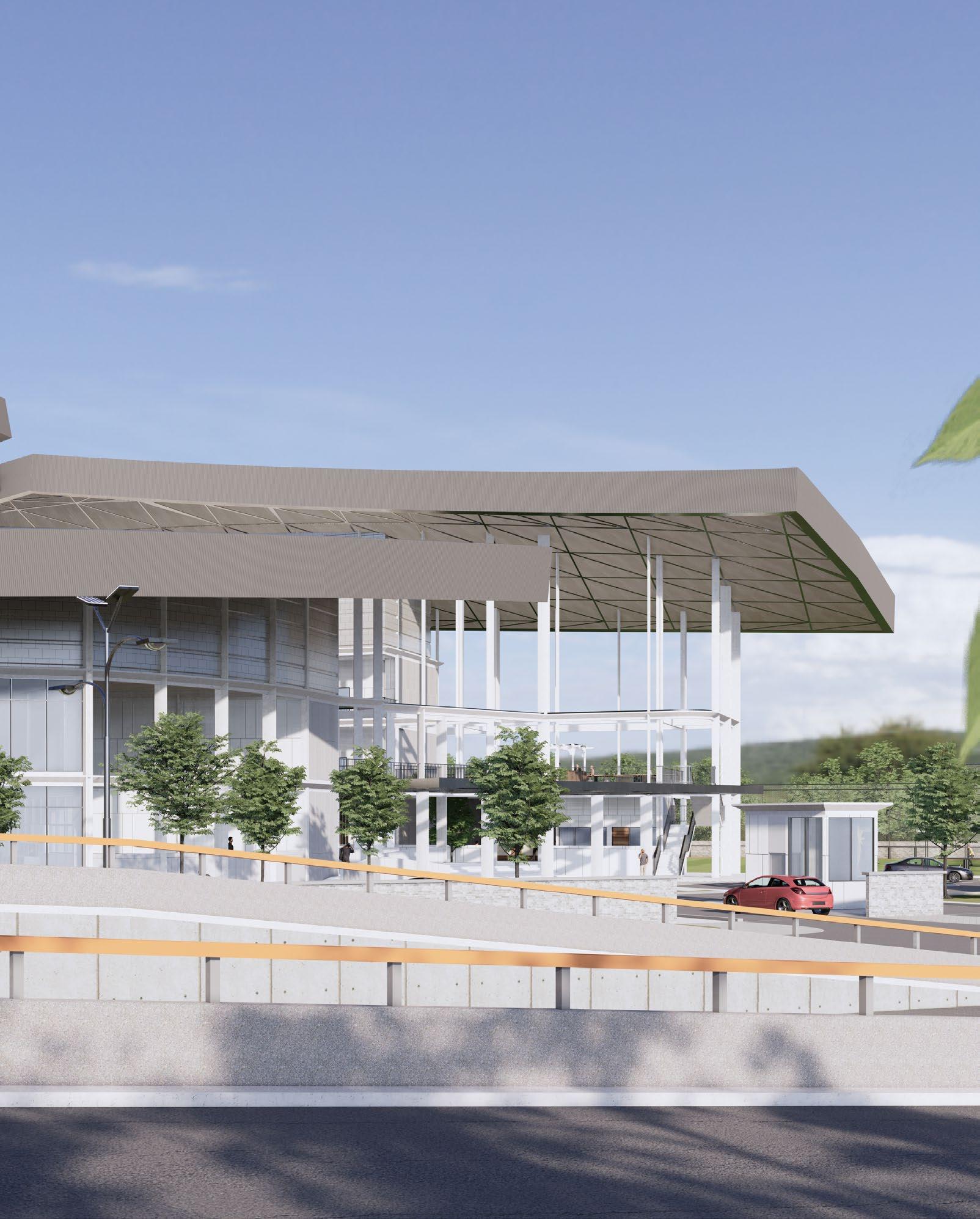 above — Presents an idea of fostering connectivity and natural ventilation, while cascading plants soften the geometric facade.