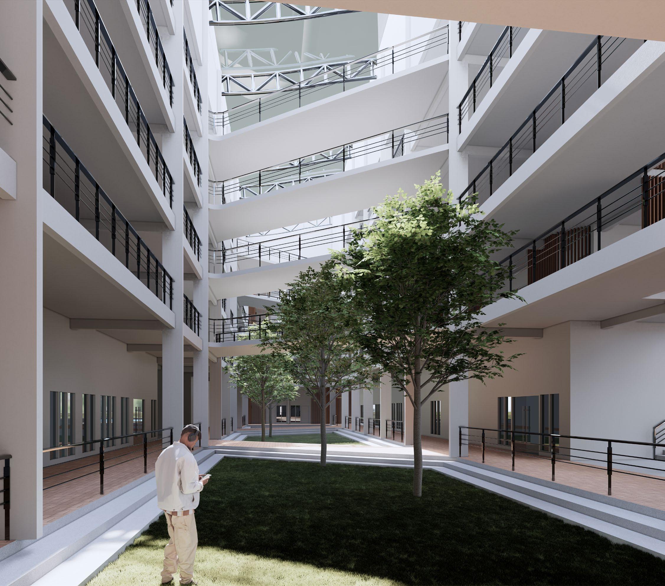 above — The openair atrium with a central green space, seamlessly blending nature with architecture.