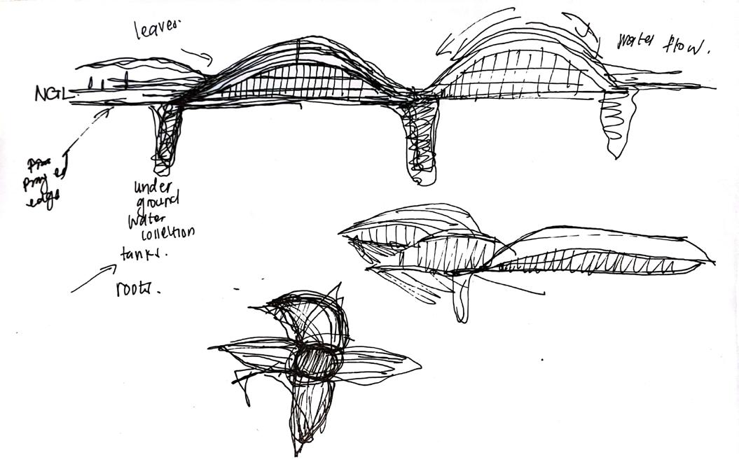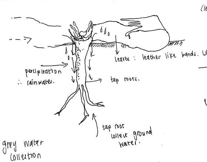 primarily consists of 2 board flat strap shaped leaves which are attached to a short wooden stems which is anchored into the ground by long taproots. The Welwitchia is carefully designed to survive and grow under arid conditions that recieve regular fog. The leaves lie close to the ground keeping the desert surface cool and “damp” and the leaves are shaped to direct condenstation to the stem of the plant while the taproots collect under ground water. In this project the principles of the welwitchia plant were adapted and explored to create the Welwitschia Mirabilis building