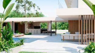 La necesidad de abrirse al exterior y eliminar los límites del dentro/ fuera, esculpen la arquitectura de un modo que se crea un equilibrio entre la vida en el jardín y en el interior. Las formas dinámicas, los materiales naturales y el control de la luz buscan humanizar la arquitectura, escapando de modas y estéticas asépticas desligadas del entorno.