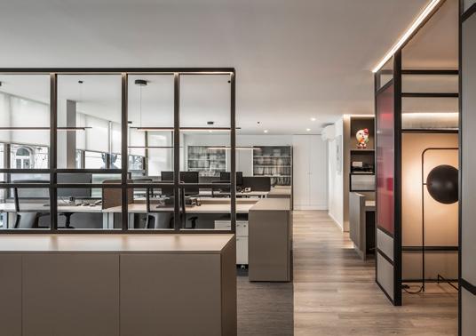 La elección de materiales junto con el uso de una gama cromática que navega entre los grises taupé y el negro, otorgan al espacio calidez y elegancia. Las notas de color las pone el bermellón, color corporativo, representando el carácter y la personalidad de una empresa. La retícula en mamparas tan característica del estilo de Mondrian y las obras de arte del propietario hacen que en ciertos momentos el usuario se sienta en una galería de arte más que en unas oficinas.