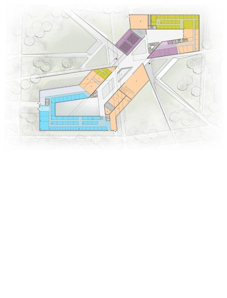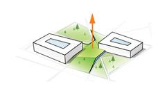 La intersección entre los antiguos caminos ya perdidos y los ejes diagonales del campus, determinan las limitaciones espaciales de la construcción y el nivel del terreno. Esto crea dos composiciones exentas que espacial y funcionalmente se conectan mediante una pequeña loma de terreno que se levanta del nivel de calle. La entrada se genera en el encuentro donde convergen todos los ejes, bajo el manto natural-
