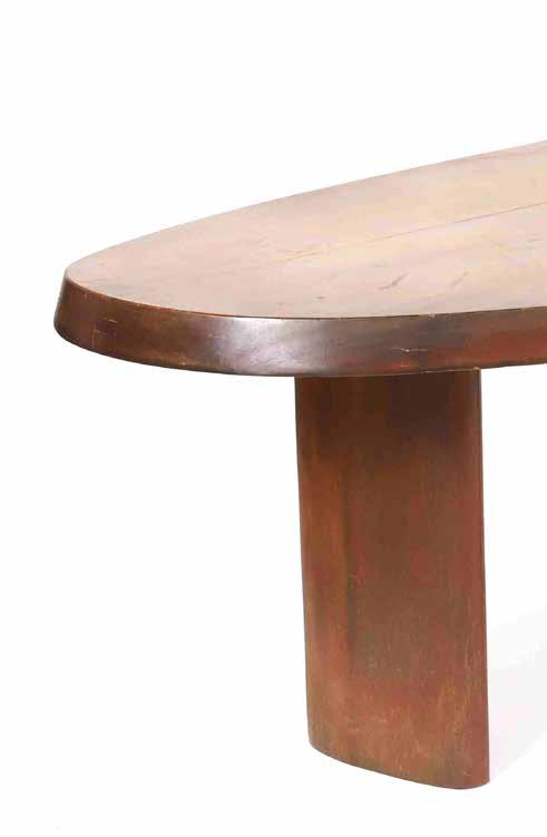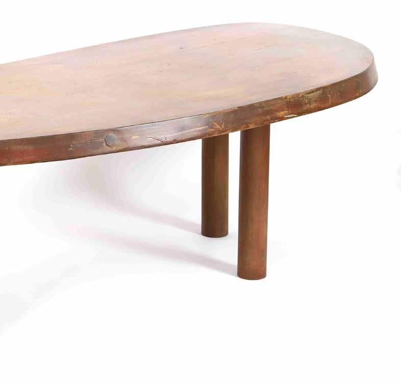 En lot de phare de cette vacation, une exceptionnelle table dite «forme libre» de Charlotte Perriand qui n’est pas dessinée au hasard, les formes sont fonctionnelles et rationnelles, transcendées par la capacité si particulière de Charlotte Perriand à intégrer les contraintes diverses et à répondre aux gestes et un besoin. Contrairement à la production industrielle, chaque table est unique et singulière, comme les membres d’une famille. - Mes tables en bois massif, raconte Charlotte Perriand, étaient l’œuvre de Jean!’ Chetaille. (...) Comme je regrette que Chetaille n’ait pas apposé son poinçon sur la production de son atelier !