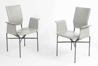 Ensemble de 2 fauteuils à piètement en métal tubulaire. Assises, dossiers et accotoirs recouverts de cuir gris clair.