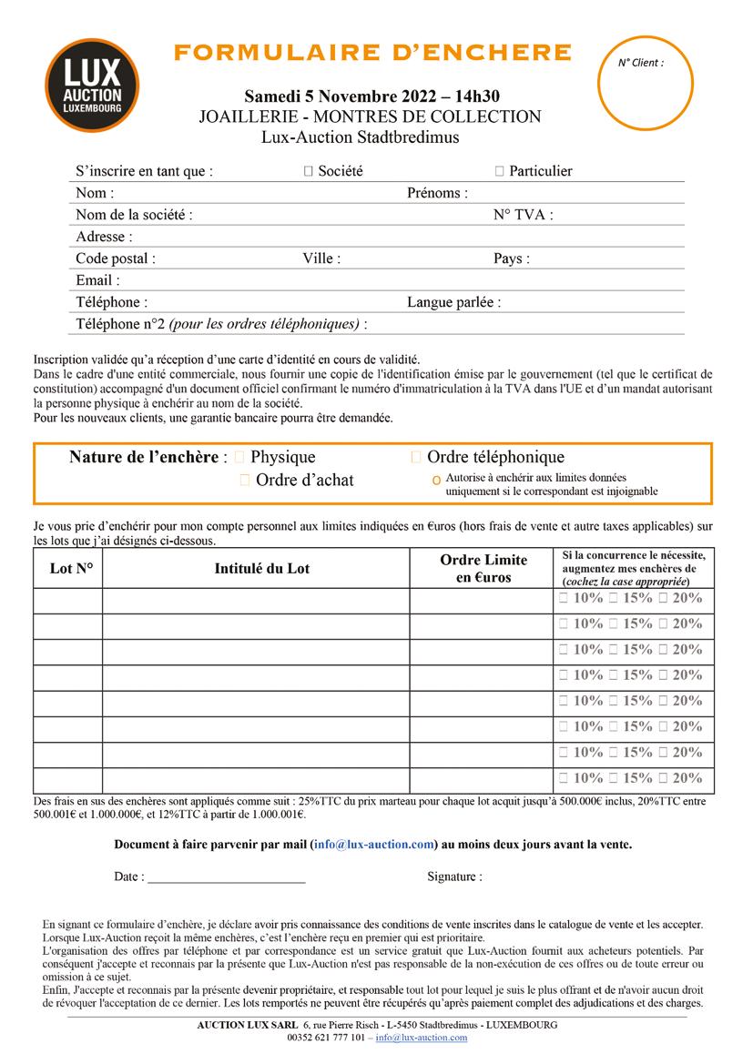 3) LUX-AUCTION accepte gracieusement de recevoir des enchères par ordre d’achat ou téléphone d’un acquéreur potentiel qui se sera manifesté avant la vente.