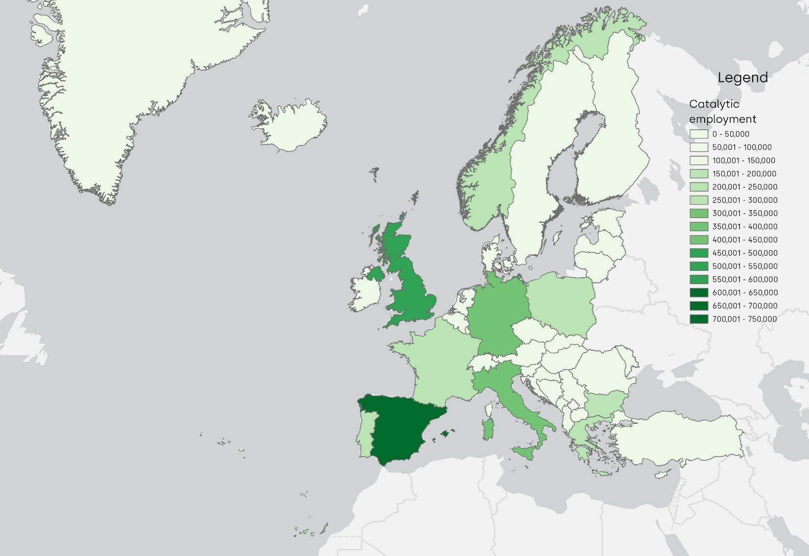 Note: The map shows the total number of employees supported by the direct, indirect and induced footprints of tourism generated by regional air transport across Europe by country. The darker shading indicates that more employment is generated within a given country. The list of countries and sub-national territories considered is set out in section 2.1.2 and in Annex 4.6A1 Only airports located in the European part of Turkey have been considered.
